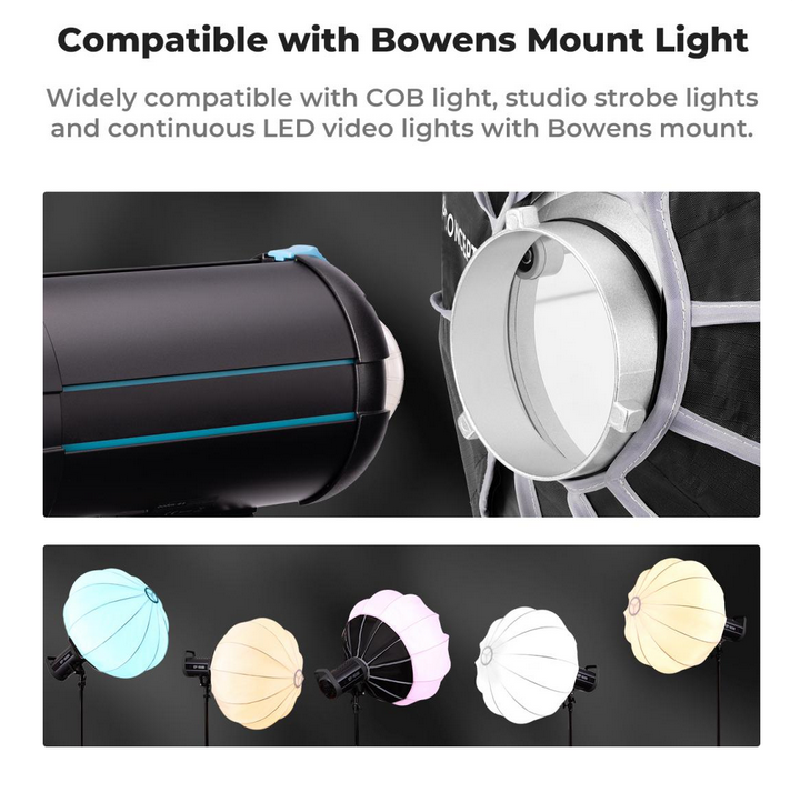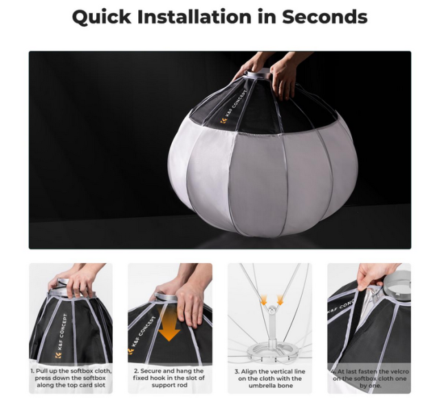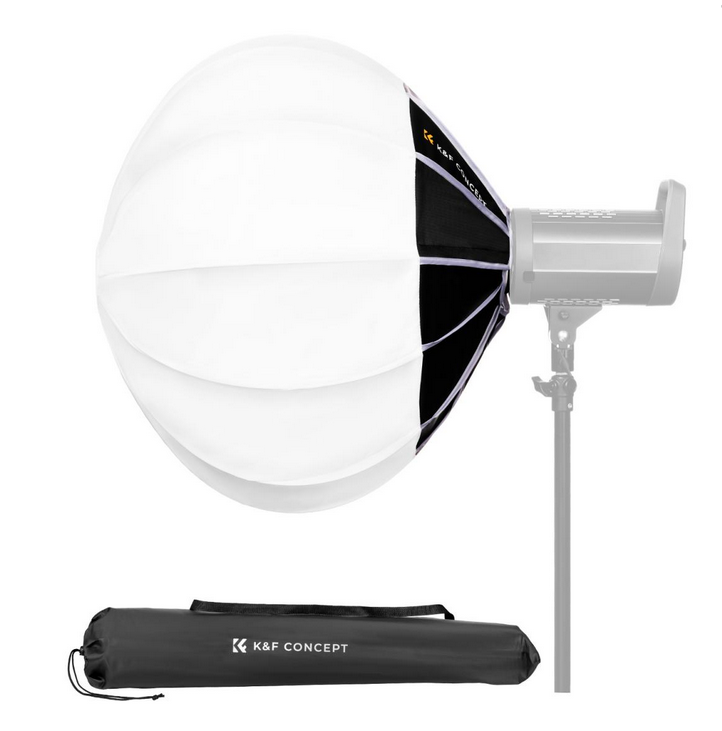 El softbox K&F 85CM Lantern está diseñado para fotógrafos y cineastas que necesitan una solución de iluminación versátil y eficaz. Su diseño esférico garantiza una luz suave omnidireccional en un rango de 360°, por lo que es ideal para su uso en estudio, ya que difunde la luz de manera uniforme con un ángulo de emisión de 270°. Esta caja de luz tipo linterna es ideal para crear una iluminación suave y uniforme en una superficie amplia utilizando una sola fuente de luz.