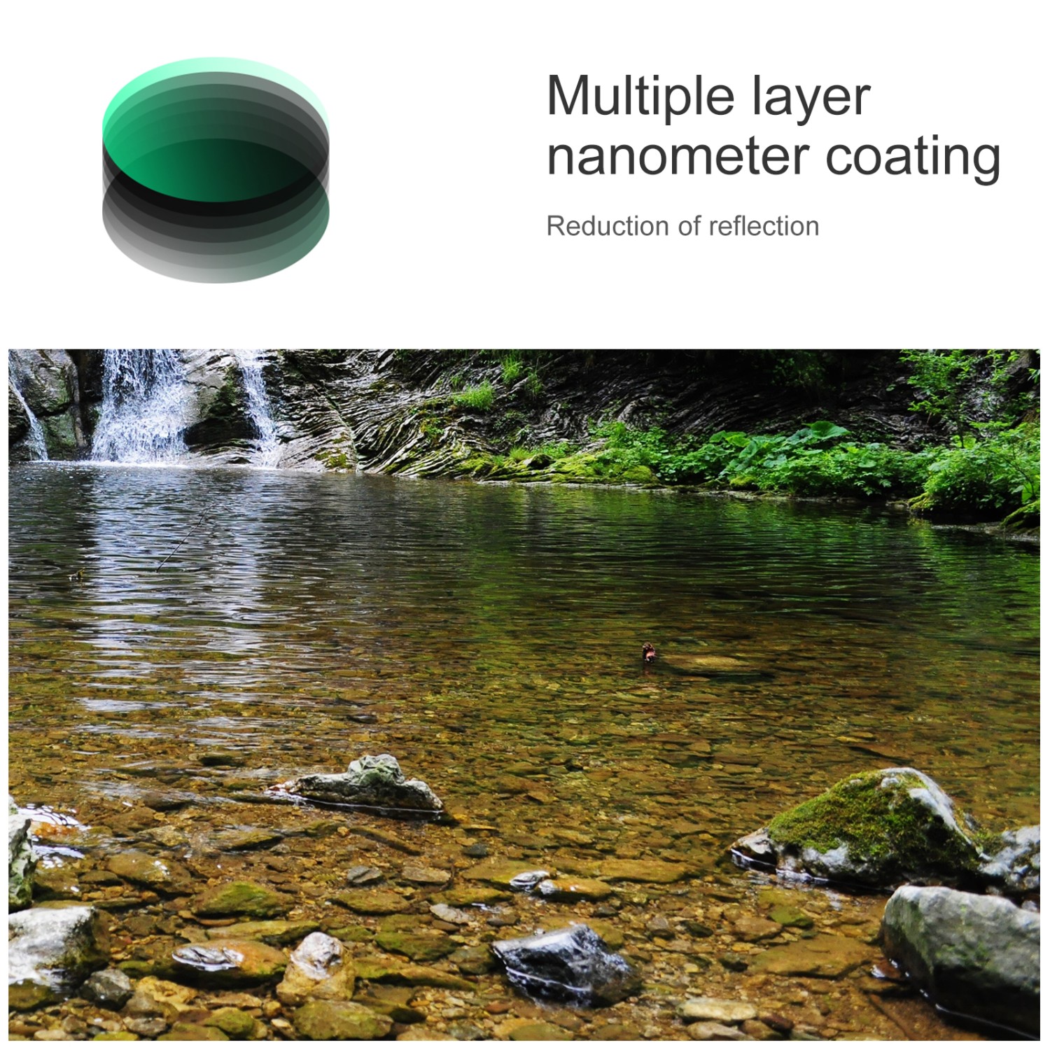 * 【Doble recubrimiento】 Se ha utilizado una tecnología de doble recubrimiento de 28 capas; el recubrimiento verde ayuda a reducir eficazmente la reflectividad de la superficie del filtro y los reflejos, al tiempo que hace que el filtro sea resistente a los arañazos, al agua, al aceite y al polvo.