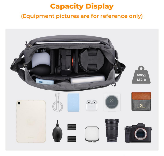 Una versátil bolsa para cámara con una capacidad de 10 litros, fácil de transportar, que ofrece una excelente protección y cuenta con compartimentos bien organizados para el equipo fotográfico profesional y los objetos de uso diario.