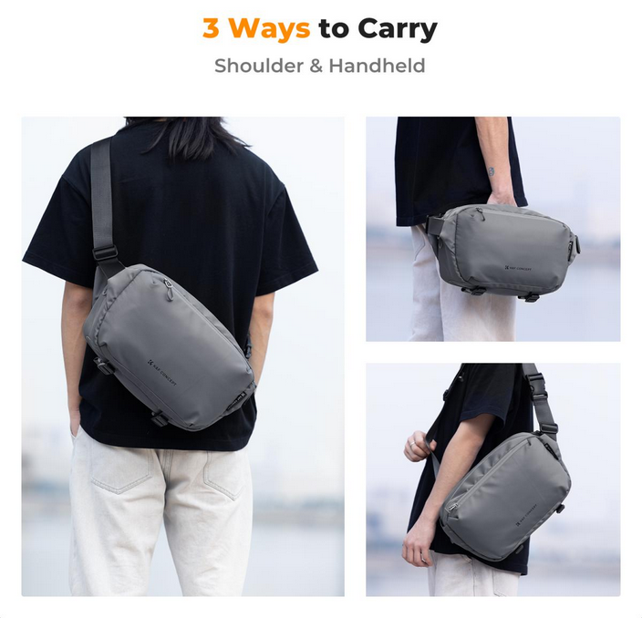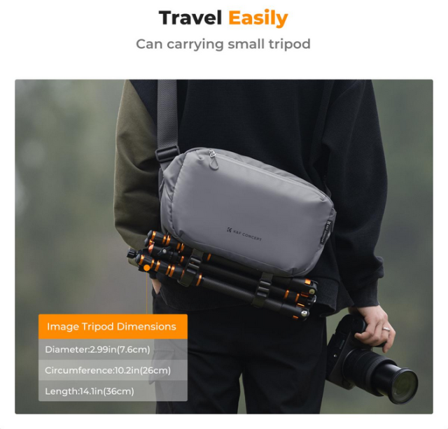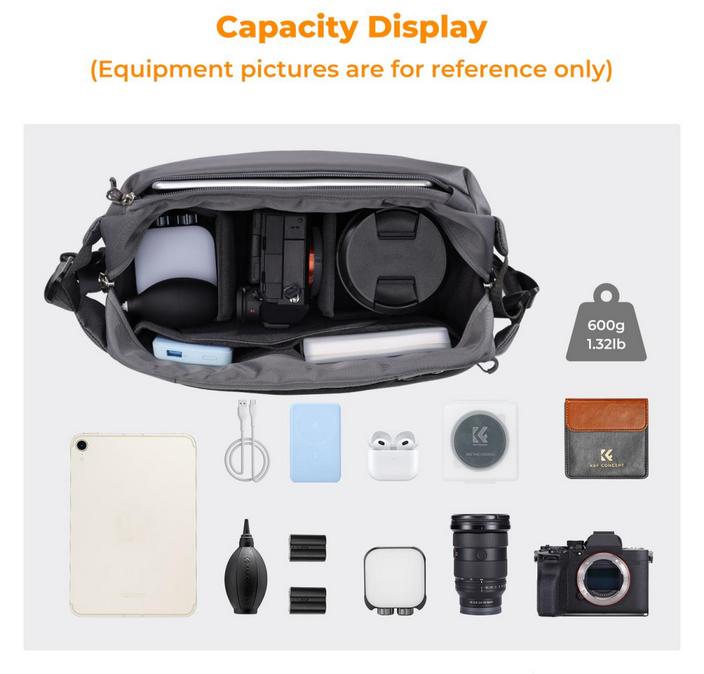 La mochila K&F Alpha Sling Bag 10L (gris) combina practicidad, comodidad y seguridad en un diseño elegante y multifuncional. Esta mochila, con una capacidad de 10 litros, es compacta pero lo suficientemente espaciosa como para albergar una cámara y dos objetivos, junto con los accesorios imprescindibles y objetos personales.