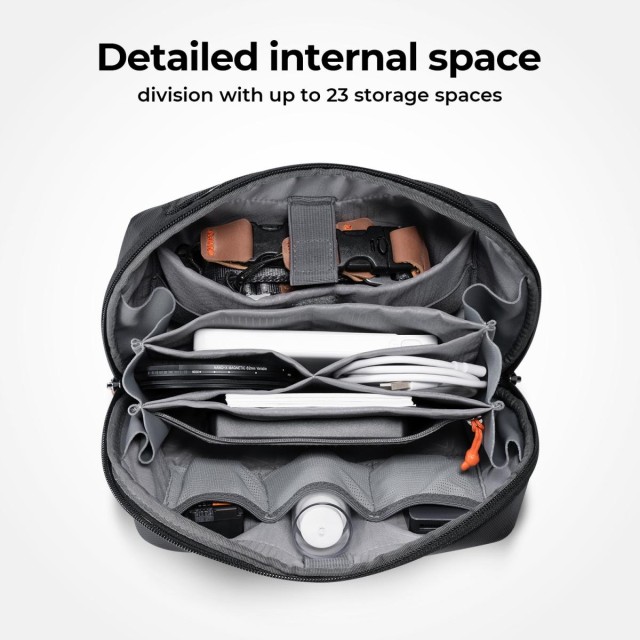 Diseño ligero con una distribución detallada del espacio interior y hasta 23 compartimentos. Podrás guardar de forma ordenada y organizada teléfonos móviles, cargadores, cables de datos, baterías externas, memorias USB, ratones, llaves del coche, tarjetas bancarias, etc.