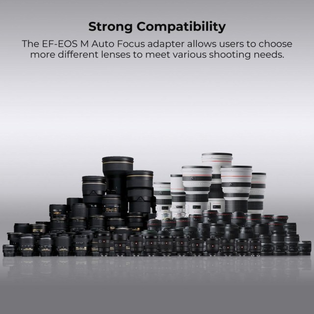 * Amplia compatibilidad. Apto para objetivos Canon EOS con montura EF y EF-S para cámaras réflex digitales y cámaras Canon EOS M, EOS M2, EOS M3, EOS M5, EOS M6, EOS M10, EOS M50, EOS M100, EOS M50 II, EOS M6 II y EOS M200, y ofrece a los usuarios de cámaras EOS M una mayor variedad de objetivos.