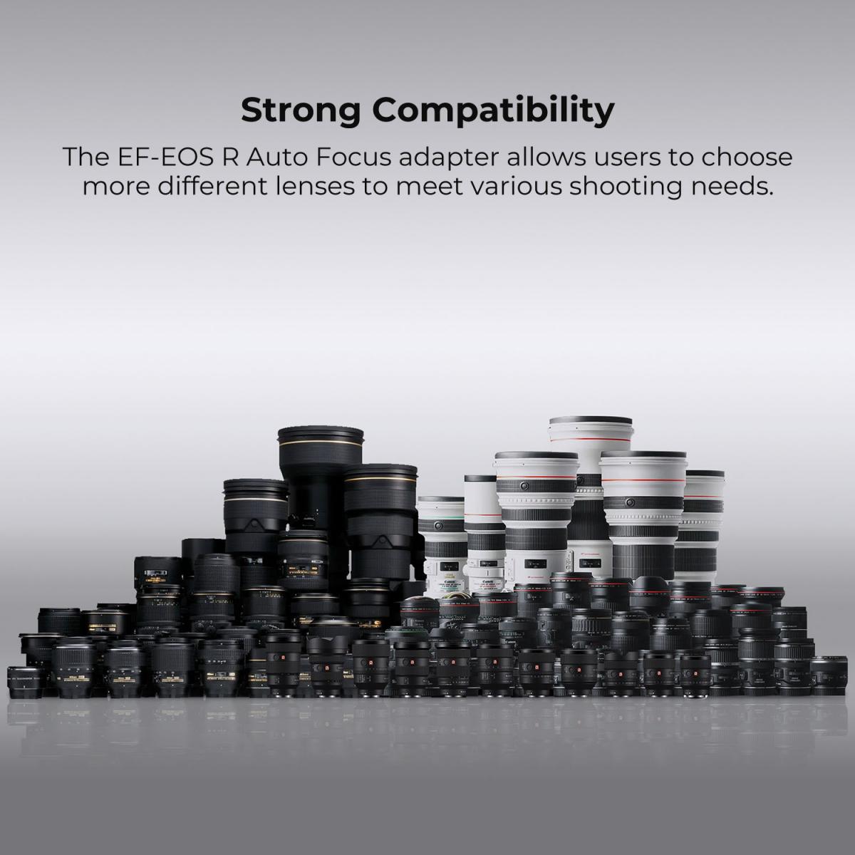 * Amplia compatibilidad. Apto para objetivos Canon EOS con montura EF y EF-S para cámaras réflex digitales y las cámaras Canon EOS R6, EOS R50, EOS R100, EOS R3, EOS R5C, EOS R5, EOS R6 Mark II, EOS RP, EOS 7, EOS 10 y EOS RP, y ofrece a los usuarios de cámaras EOS R una selección más amplia de objetivos.