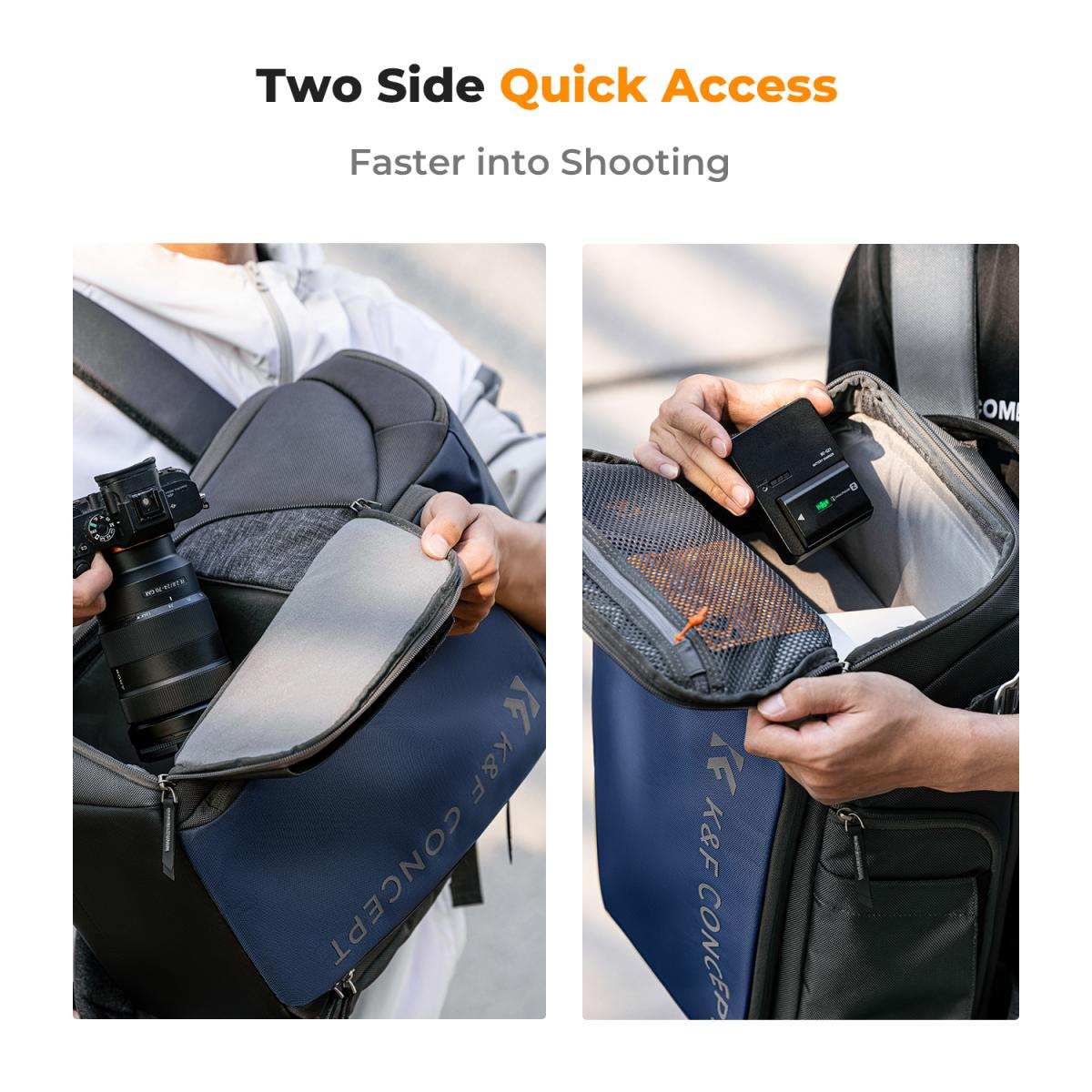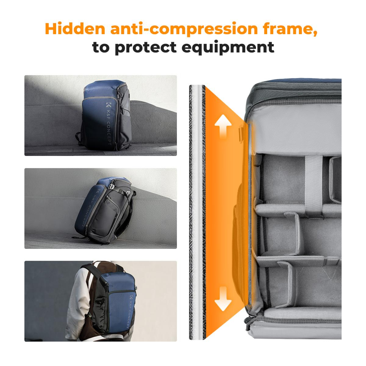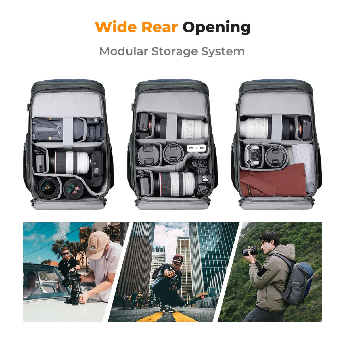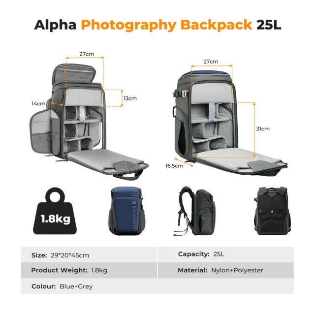 Mochila K&F Concept Camera Alpha Backpack Air 25L, mochilas fotográficas de gran capacidad con funda impermeable para fotógrafos - Mochila 25L Nature Wander 01 (azul). Esta mochila fotográfica permite distribuir el espacio en una proporción de 5:5 o 2:8, ajustándola hacia arriba o hacia abajo según las necesidades. Ideal para fotografía al aire libre, fotografía urbana de calle, retratos al aire libre, fotografía VIOG, etc.