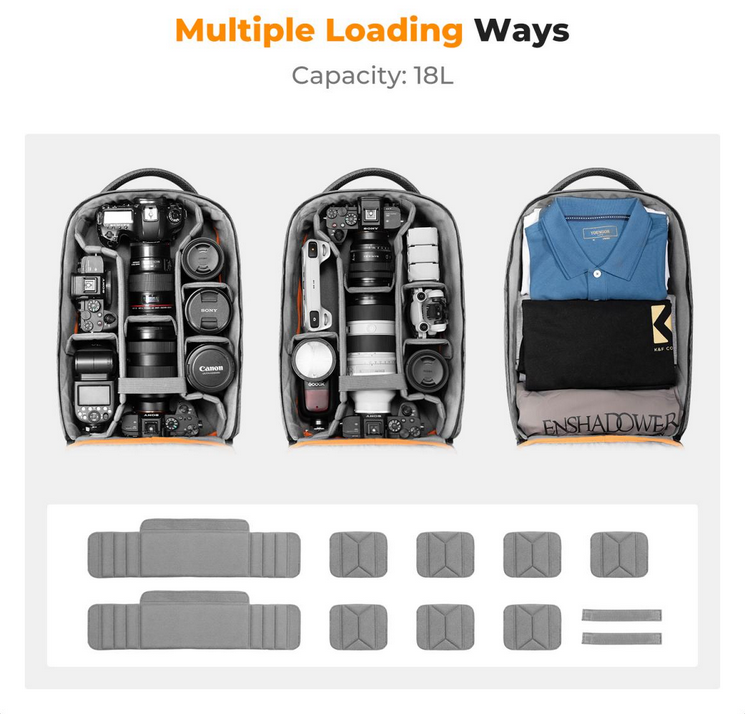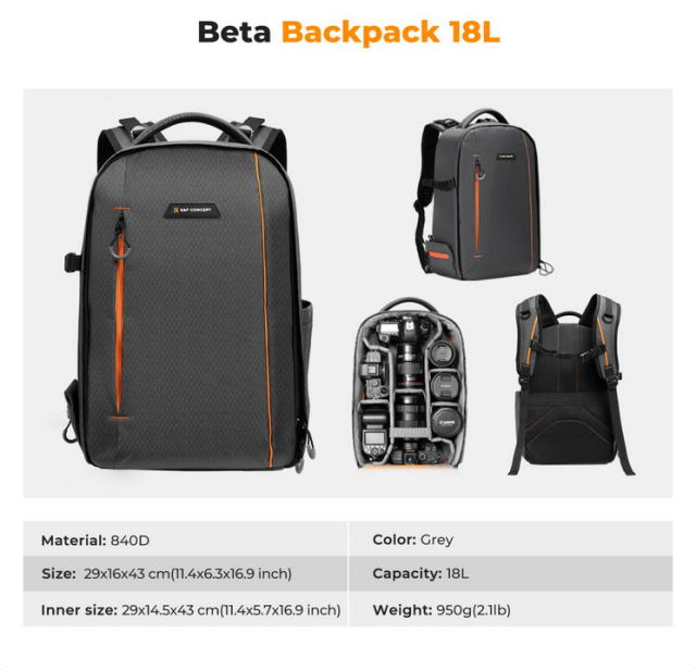 La mochila K&F Beta Backpack 18L en color gris oscuro es una bolsa para cámara ligera y adaptable, diseñada para fotógrafos que viajan, con capacidad para el equipo básico y que garantiza la comodidad durante las sesiones fotográficas prolongadas.
