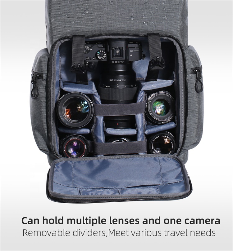- * Las dos carcasas superior e inferior de material EVA moldeado en el panel frontal son sólidas, duraderas y resistentes a los golpes. Los compartimentos superior e inferior están divididos en cestas: la cesta inferior es para la cámara, la superior es para objetos (ropa, drones, etc.) y la superior es para baterías, tarjetas de memoria y cables de datos. Los compartimentos superior e inferior se pueden separar o conectar entre sí, y el compartimento inferior para el equipo se puede montar a medida.