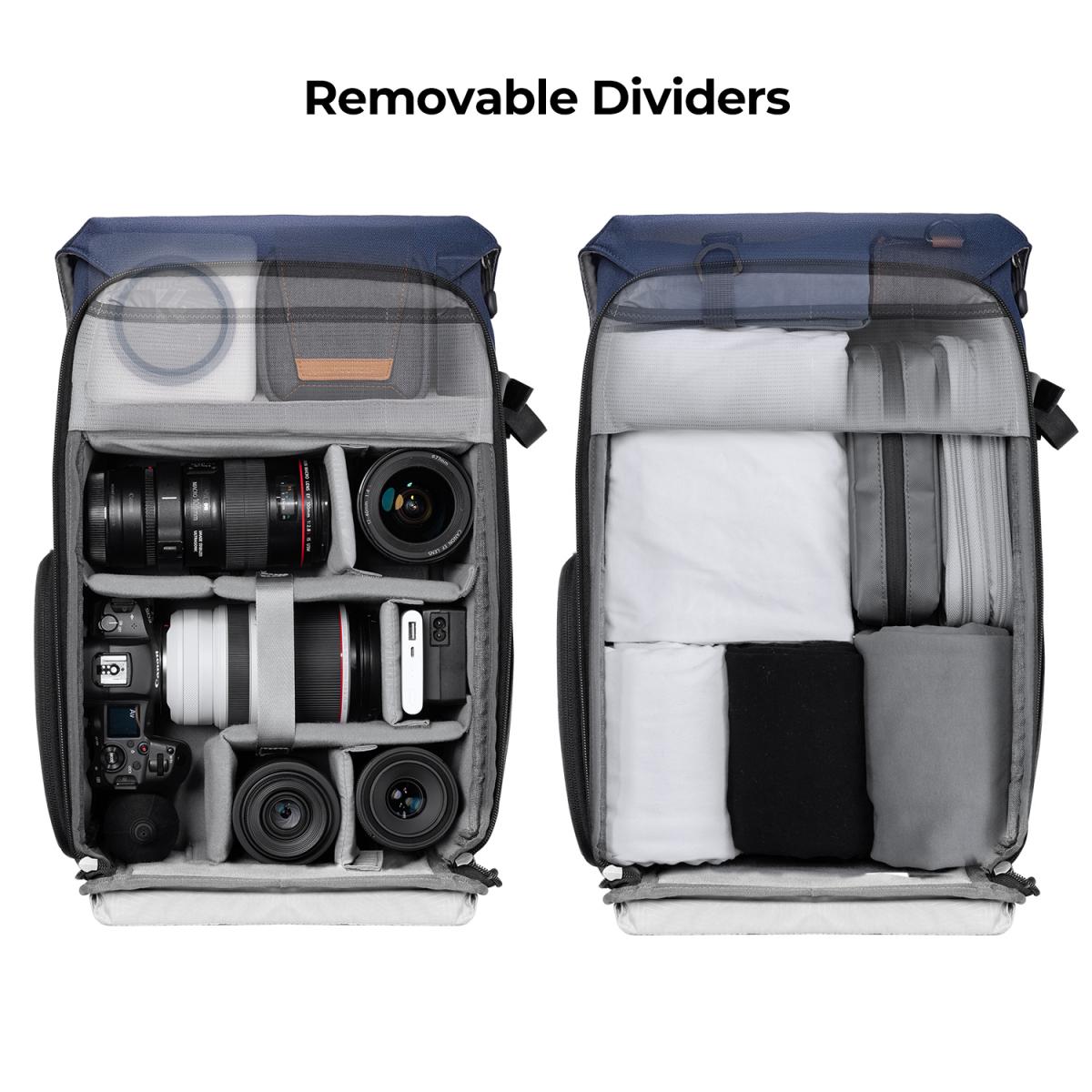 - * 【Almacenamiento organizado y flexible】 El cuerpo principal de la mochila para cámara K&F Concept está dividido en tres secciones: para la cámara y el equipo, un portátil de 15,6" y otros objetos personales. Gracias al separador extraíble, la mochila para cámara se puede adaptar para crear un espacio de almacenamiento organizado y práctico para tus viajes y el transporte de tu equipo fotográfico.