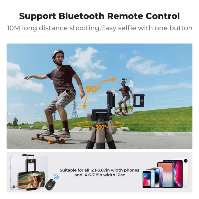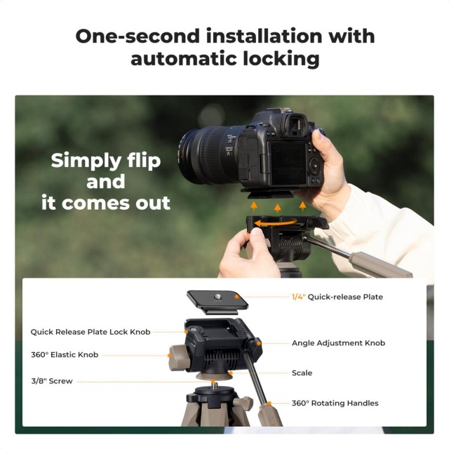• * 【Estructura triangular plegable】 que garantiza una mayor estabilidad del trípode al fotografiar en exteriores. El cabezal del trípode puede soportar hasta 4 kg, admite un giro horizontal de 360°, un ángulo de inclinación ajustable de +100°/-70°, y la placa de fijación rápida se puede girar horizontalmente para adaptarse a las necesidades de filmación desde múltiples ángulos.