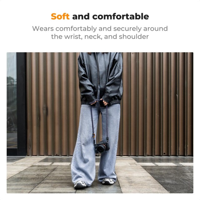 La correa ligera y suave proporciona una gran comodidad al llevarla colgada al cuello, incluso durante un uso prolongado, ideal para largas sesiones fotográficas.