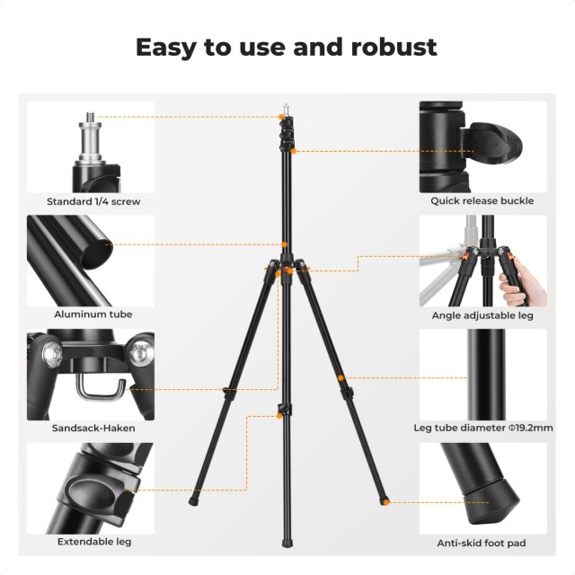El trípode está fabricado en una resistente aleación de aluminio y soporta hasta 5 kg. Está equipado con un gancho para colgar bolsas de arena para una mayor estabilidad y cuenta con una separación ajustable entre las patas para un apoyo más firme.
