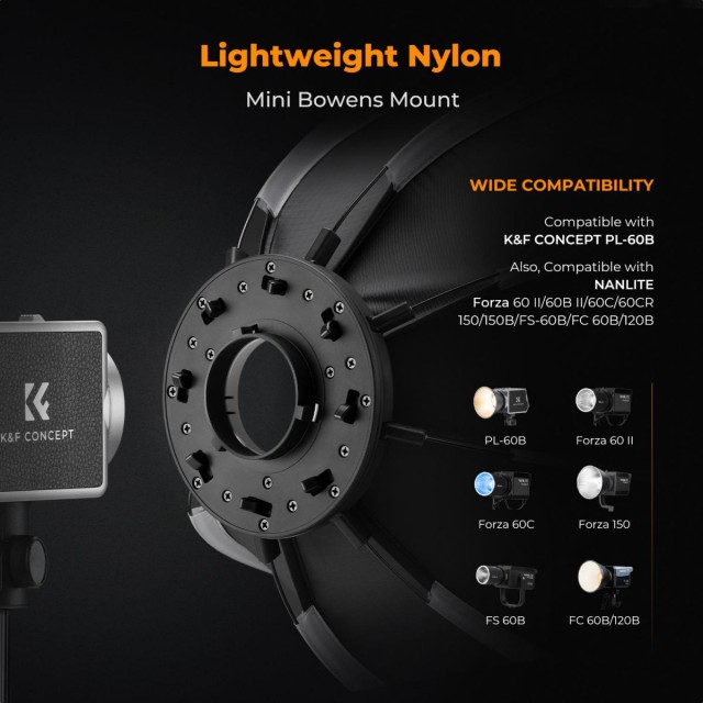 Diseñado específicamente para la luz PL-60B COB, no requiere ningún adaptador adicional para su instalación. También es compatible con las luces Nanguang Forza 60 II/60B II/60C/60CR/150/150B, FS-60B y FC 60B/120B.