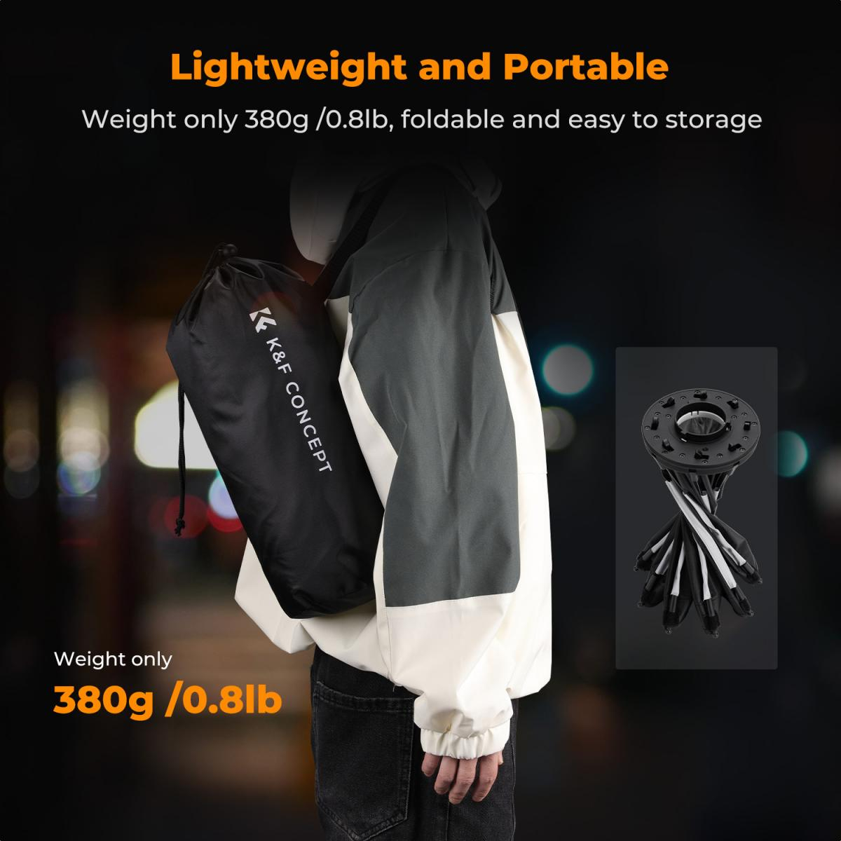 Pesa solo 380 g, lo que lo convierte en la opción ideal para grabaciones móviles. Se pliega hasta alcanzar unas dimensiones de tan solo 36 × 14 × 14 cm y se suministra con una bolsa de almacenamiento, por lo que cabe fácilmente en una mochila o maleta. Ya sea para sesiones fotográficas diarias o viajes largos, no supone ninguna carga adicional.