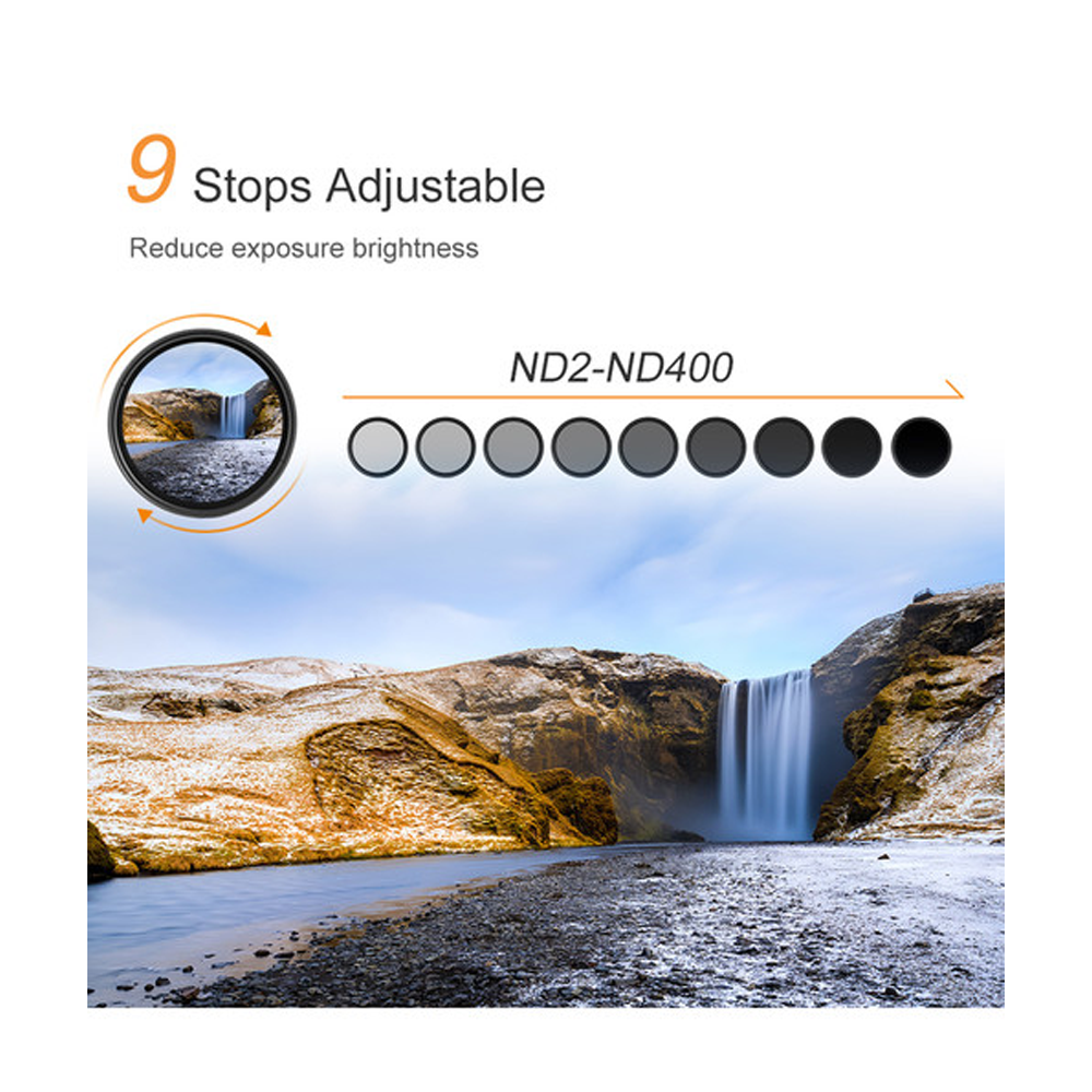Consigue un control flexible y preciso de la exposición con el filtro K&F Concept de 43 mm True Color Variable ND2–ND400, diseñado para creadores que necesitan versatilidad en condiciones de iluminación cambiantes. Este filtro neutro ajustable cubre un amplio rango de ND2 a ND400 y permite reducir la luz entre 1 y 9 pasos, lo que permite velocidades de obturación más lentas, aperturas más amplias y efectos de movimiento fluidos incluso bajo la luz solar intensa. El filtro está fabricado con cristal óptico de alta calidad y conserva los colores fieles sin tintes indeseados, al tiempo que se mantiene fiel al principio de «densidad neutra»: reduce la cantidad de luz sin alterar los tonos naturales de la escena. Girando el elemento frontal, puedes ajustar fácilmente los niveles de densidad, lo que sustituye la necesidad de varios filtros ND individuales. Este VND también funciona de manera similar a un mecanismo polarizador, ya que regula la cantidad de luz que entra en el objetivo al girarlo. Ya sea que fotografíes agua en movimiento, nubes que se desplazan lentamente, grabes tomas cinematográficas o retratos con poca profundidad de campo en exteriores, este filtro ultradelgado y ligero elimina el viñeteado y garantiza imágenes nítidas y muy luminosas. Gracias a su diseño, es una herramienta indispensable para fotógrafos y cineastas que desean una flexibilidad total en la exposición sin necesidad de procesamiento posterior.