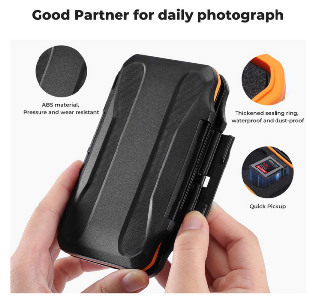 - Protección resistente: La carcasa resistente, fabricada con material ABS de primera calidad, protege las tarjetas de memoria contra arañazos, golpes y el desgaste diario. El anillo de sellado de silicona garantiza una excelente resistencia al agua, al polvo y a la suciedad, y protege tus tarjetas en entornos exigentes.