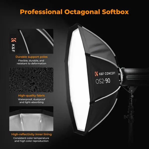 El softbox octogonal plano K&F CONCEPT de 65 cm es un modificador de luz de montaje rápido con montura Bowens que crea una iluminación uniforme, suave y favorecedora con reflejos naturales, ideal para retratos, moda, entrevistas y sesiones fotográficas o grabaciones in situ.