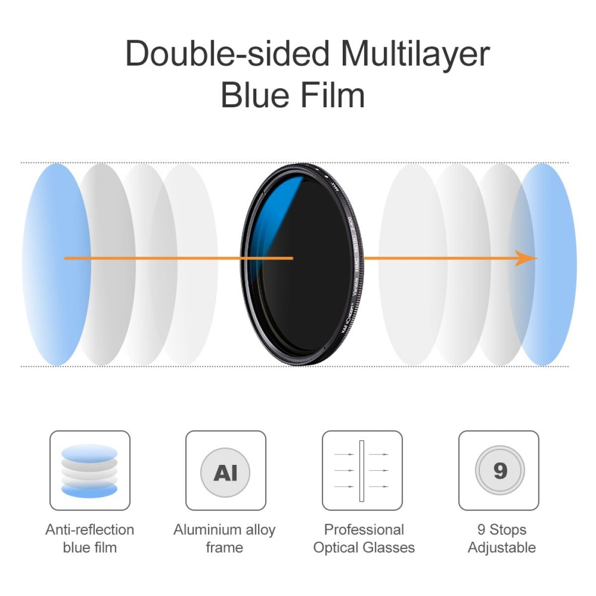 El filtro está fabricado con cristal óptico de primera calidad, ofrece una claridad excelente y minimiza la distorsión óptica. Al girar el elemento frontal, se puede pasar de forma continua de un nivel ND a otro, lo que sustituye a varios filtros ND fijos y proporciona una flexibilidad inigualable al fotografiar en exteriores. El marco de aluminio ultradelgado ayuda a evitar la viñeteado incluso con objetivos gran angulares, mientras que su construcción resistente garantiza una fiabilidad duradera. Este filtro VND es ideal para fotografía de paisajes, retratos con poca profundidad de campo, efectos de desenfoque de movimiento, grabaciones de vídeo con luz diurna intensa y trabajos creativos con exposición prolongada. Es una herramienta imprescindible para lograr una exposición consistente y un control artístico.