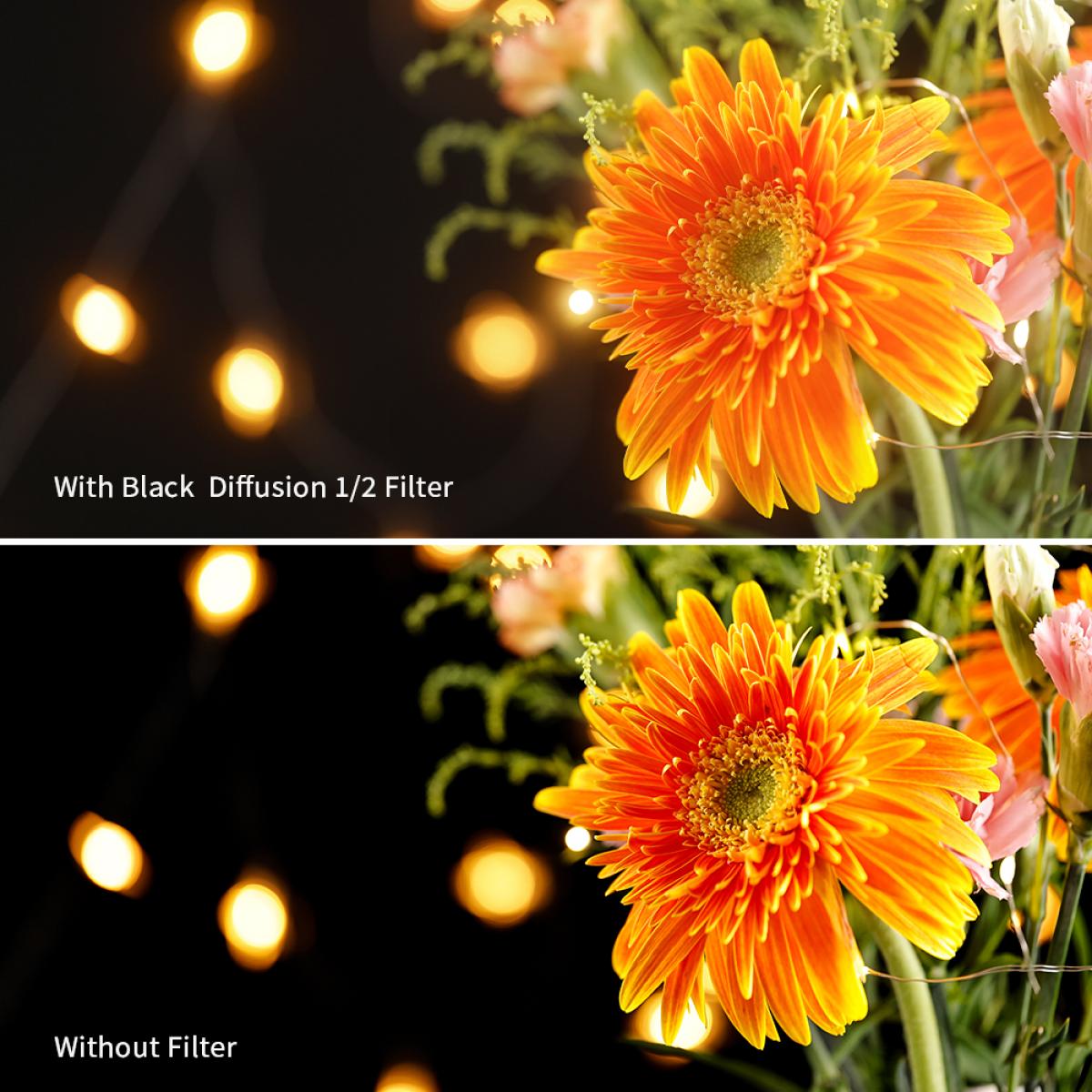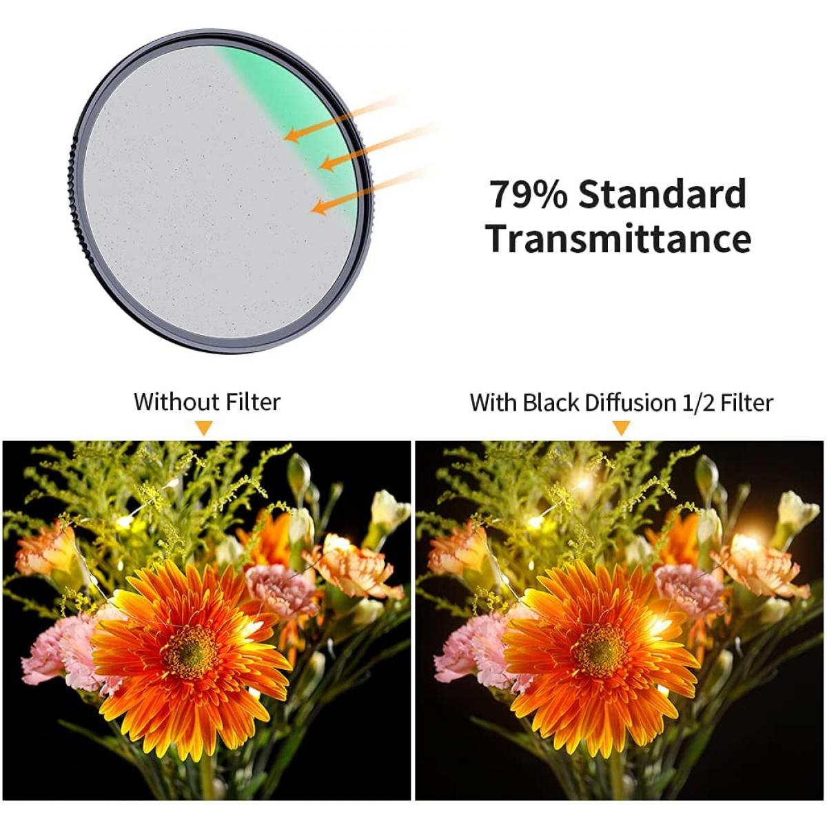 • * 【Características】 Gracias al filtro difusor suave K&F Concept 1/2 negro, la imagen o el vídeo resultan suaves y se controlan los reflejos de luz, por lo que la piel y los poros se ven más finos; la tecnología de pulido a doble cara garantiza una alta resolución en el rango de distancia focal de 550 mm. Equipo fotográfico para sesiones de San Valentín.
