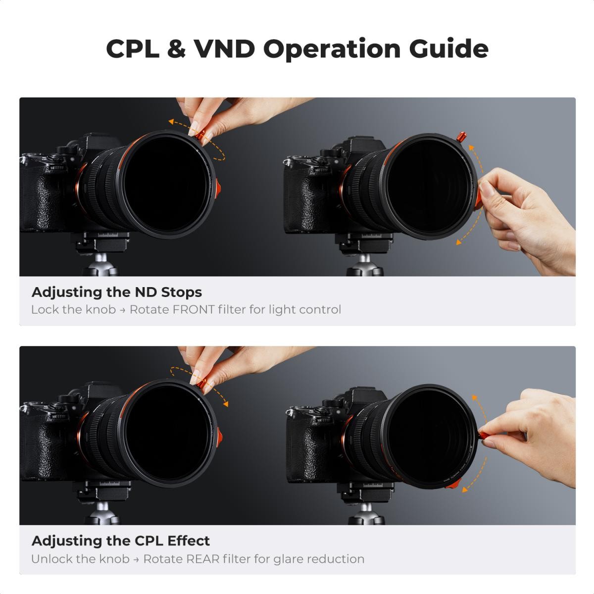 Gracias a su diseño magnético de cambio rápido, los filtros se acoplan al instante sin necesidad de atornillarlos, lo que resulta ideal para sesiones fotográficas rápidas o cambios frecuentes. El filtro ND3–32 ofrece cambios de densidad fluidos y precisos gracias a los topes integrados y un giro silencioso y suave gracias a su construcción de teflón de alta calidad, ideal para cineastas que utilizan micrófonos direccionales. El CPL aumenta el contraste, elimina los reflejos y realza los colores, mientras que el filtro Black Mist 1/4 proporciona una suavidad cinematográfica, tonos claros brillantes y tonos de piel de aspecto natural.