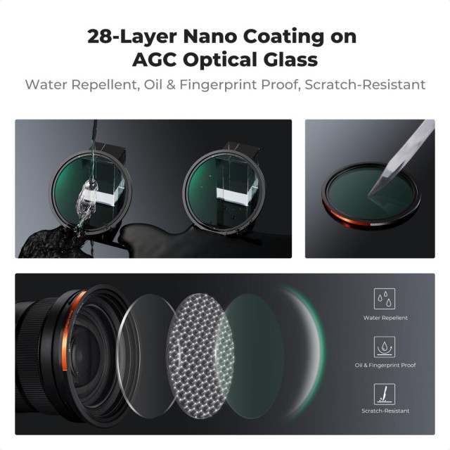 El juego de filtros magnéticos K&F CONCEPT de 82 mm de la serie Nano-X está diseñado para creadores que exigen rapidez, fiabilidad y un rendimiento óptico sin concesiones. Gracias al sistema magnético de cambio rápido, puedes acoplar o cambiar los filtros al instante sin la frustración que supone el tradicional sistema de rosca, lo que resulta ideal para condiciones de iluminación que cambian rápidamente. Cada filtro cuenta con un avanzado recubrimiento nano de 28 capas que repele el agua, el aceite, el polvo y los arañazos, al tiempo que mantiene la claridad y garantiza una limpieza fácil. Los filtros CPL y ND ofrecen una reproducción fiel del color, eliminan el tono amarillento que suele aparecer en los filtros de menor calidad y reducen la necesidad de corrección de color en la posproducción. El filtro ND3-32 se caracteriza por unos topes finales precisos y un giro ultrasuave y silencioso, lo que resulta especialmente valioso para los videógrafos que dependen de una grabación de sonido nítida. El kit se completa con el filtro atmosférico Black Mist 1/4, ideal para suavizar las zonas claras y realzar la atmósfera cinematográfica de tus tomas. Este kit, que incluye un estuche de transporte protector y un cierre de velcro, proporciona a fotógrafos y cineastas todo lo que necesitan para disfrutar de versatilidad creativa, resistencia y resultados profesionales.