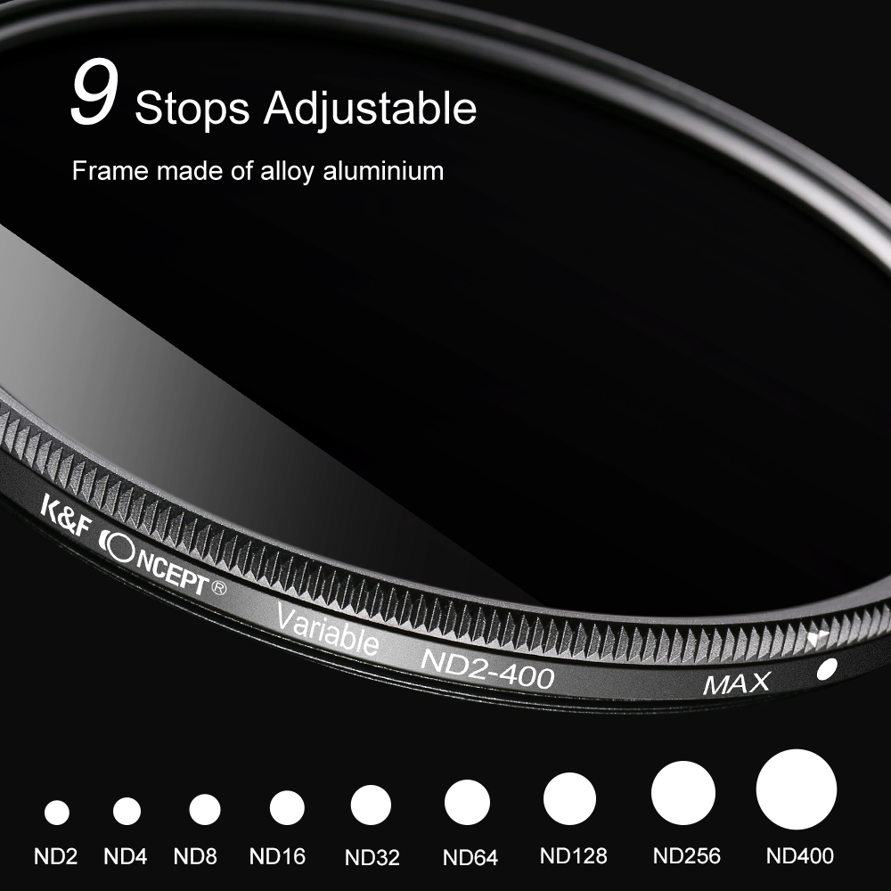 El K&F Concept 82MM Slim Variable/Fader NDX, ND2~ND400 reduce la cantidad de luz que entra en el objetivo, lo que disminuye la velocidad de obturación de la cámara. Esto resulta útil en situaciones en las que se desea crear un desenfoque de movimiento (ríos, cascadas, personas en movimiento) o cuando es necesario utilizar una apertura grande con flash para evitar la sobreexposición.