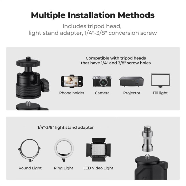La rótula de 360° totalmente ajustable, con un rango de inclinación de -90° a +90°, te ofrece total libertad a la hora de colocar tu equipo en vertical u horizontal. Gracias a la fijación con tornillo de 1/4″, la rótula de 1/4″ incluida y el adaptador de 1/4″ a 3/8″, este trípode es adecuado para una amplia gama de dispositivos, incluyendo luces LED, soportes para teléfonos, cámaras web, cámaras sin espejo y luces circulares, lo que lo convierte en una herramienta versátil e indispensable para creadores de contenido, streamers, fotógrafos y videógrafos.