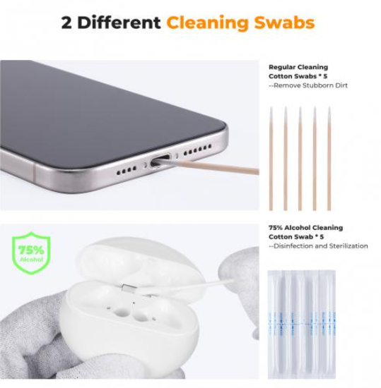 El kit K&F Concept Airpod Cleaner Kit es una solución higiénica portátil y completa para auriculares Bluetooth, como los AirPods. Incluye un lápiz multifuncional 3 en 1 que combina un cepillo suave para eliminar la suciedad resistente de la superficie exterior de los auriculares y los estuches de almacenamiento, una esponja para limpiar suavemente la superficie y un bastoncillo de algodón con memoria (espuma expandible, 2 cm de longitud) para la limpieza profunda de aceite y polvo de las cavidades de los auriculares sin dejar residuos. El mecanismo adhesivo con cinta desprendible (a base de silicona, sin residuos) se adhiere a los filtros de salida de sonido y, al retirarse, extrae las partículas acumuladas, mientras que el bastoncillo con alcohol incluido (75 % de isopropílico, punta de algodón prehumedecida) desnaturaliza las proteínas bacterianas y elimina eficazmente el 99 % de los patógenos comunes, como los estafilococos y la E. coli, para una desinfección higiénica. El paño de microfibra de acabado (7,6 x 7,6 cm, tejido sin pelusa de 200 g/m²) pule las superficies hasta dejarlas brillantes y sin marcas, y garantiza que el kit cubra todas las necesidades de limpieza —desde la eliminación inicial de manchas hasta el pulido final— en un paquete compacto listo para viajar (peso total 50 g, dimensiones 15 x 2 cm cuando está plegado). Es seguro para la electrónica sensible gracias a sus materiales no abrasivos (esponja Shore A 40, cepillo sin carga electrostática) y evita la acumulación de bacterias durante el uso prolongado, lo que favorece una experiencia auditiva más saludable para quienes se desplazan a diario al trabajo o para los entusiastas del fitness.