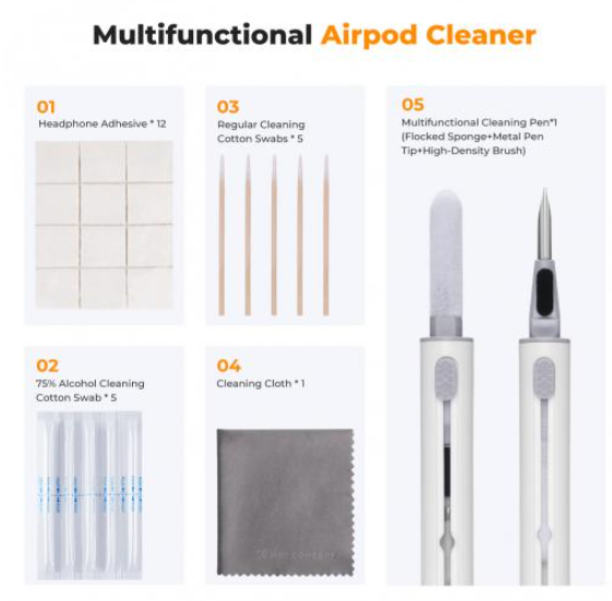 El kit K&F Concept Airpod Cleaner Kit es un lápiz limpiador multifuncional 3 en 1 con un cepillo suave, una esponja flocada, un bastoncillo de algodón con memoria, cinta adhesiva, un hisopo con alcohol y un paño de microfibra, diseñado para el mantenimiento a fondo de los auriculares Bluetooth. Elimina la grasa, el polvo, las manchas y las bacterias de las superficies, las salidas de sonido y los compartimentos, y restaura la higiene y el brillo de los AirPods o dispositivos similares.