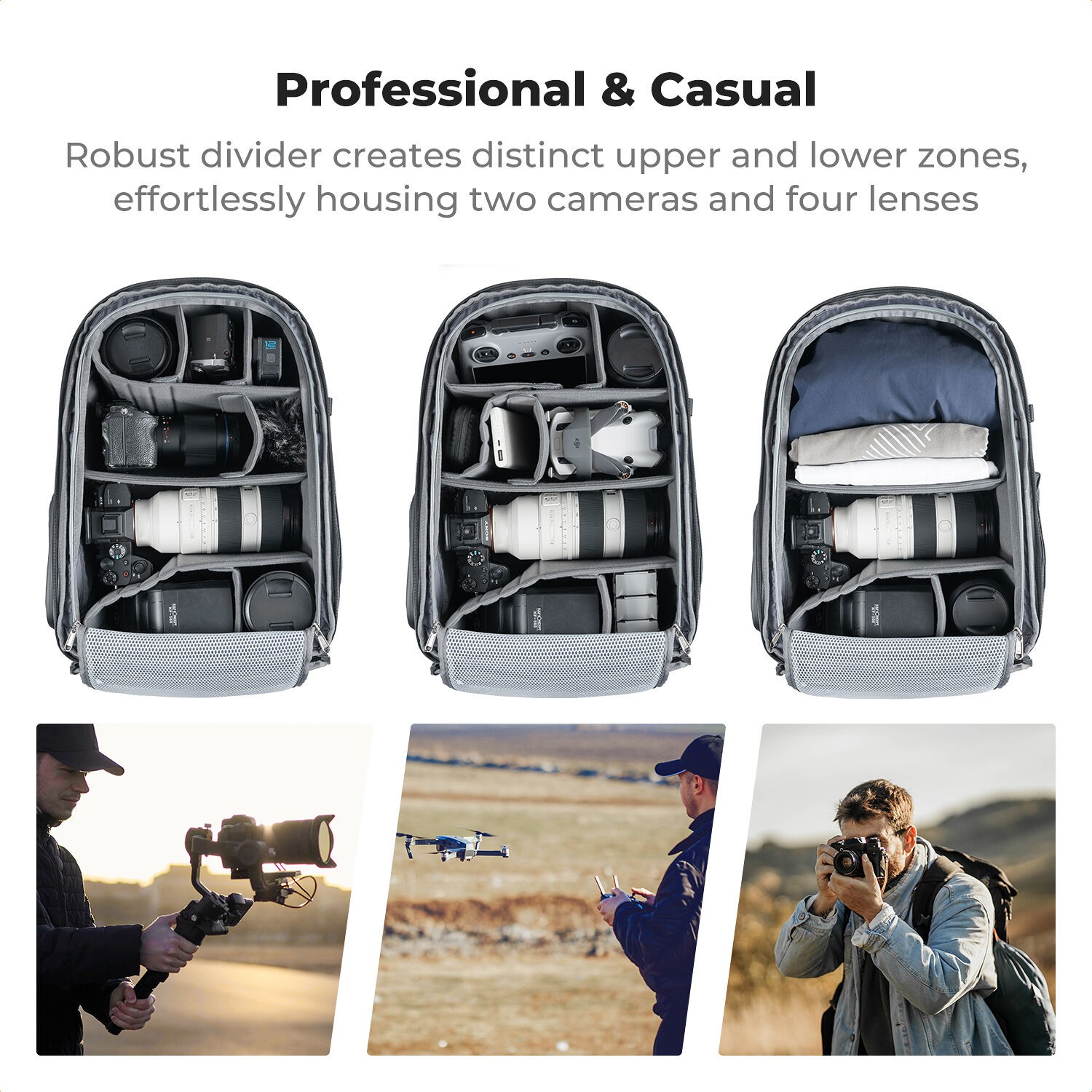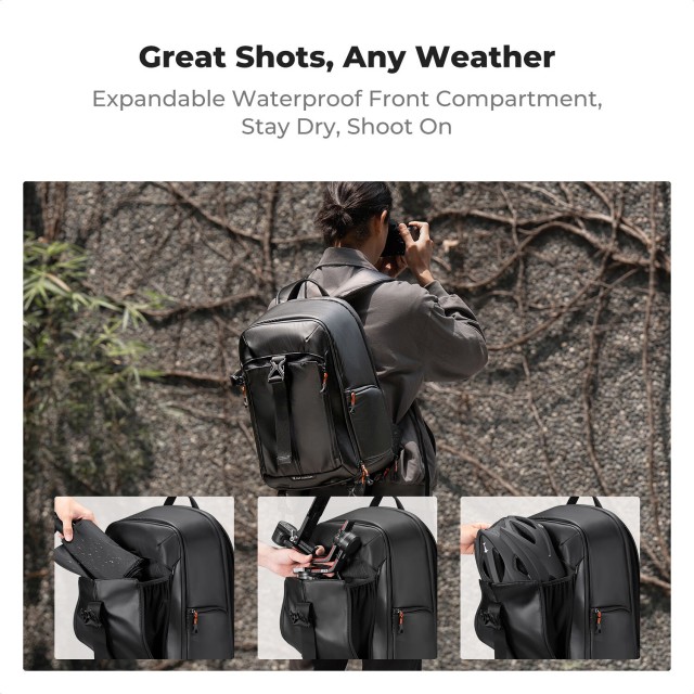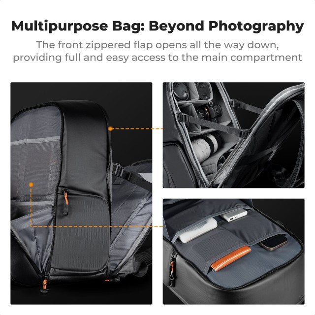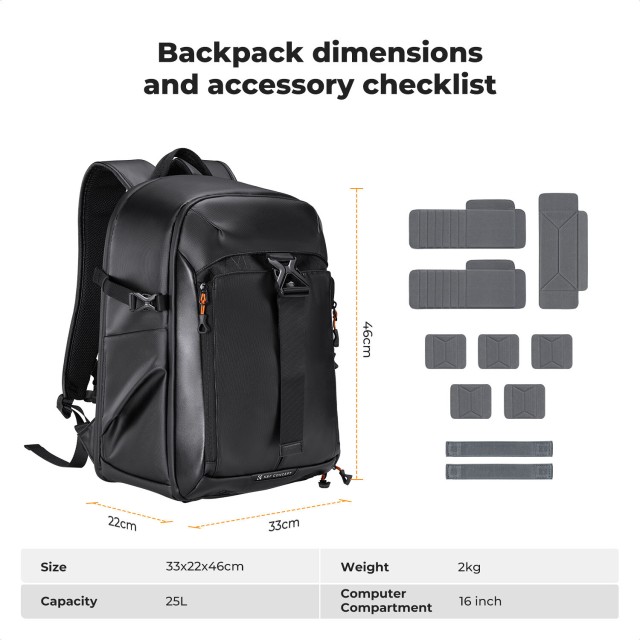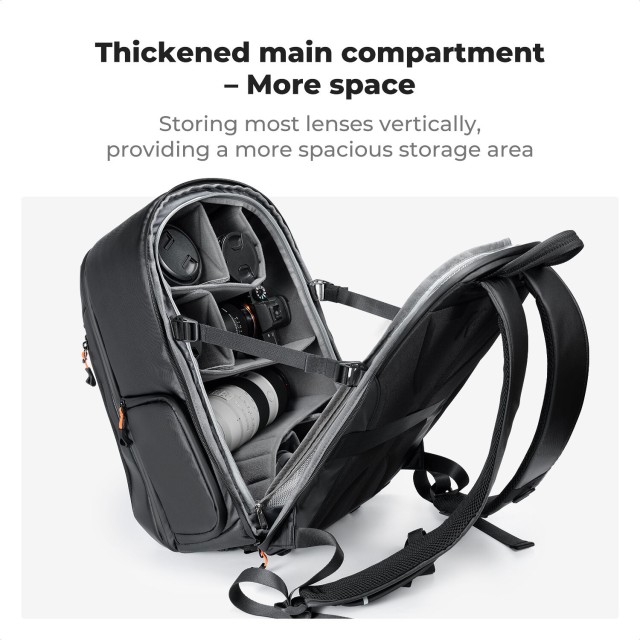 La mochila K&F Concept KF13.211 de 25 litros ofrece un equilibrio inteligente entre capacidad y portabilidad, lo que la hace ideal para los fotógrafos que viajan con frecuencia. Su diseño con solapa trasera permite un acceso total, perfecto para organizar el equipo, mientras que el panel lateral permite sacar rápidamente la cámara sin necesidad de quitarse la mochila. Los separadores de espuma ajustables protegen las cámaras réflex digitales o sin espejo, los objetivos de repuesto y los accesorios, mientras que el compartimento acolchado protege el portátil o la tableta.
