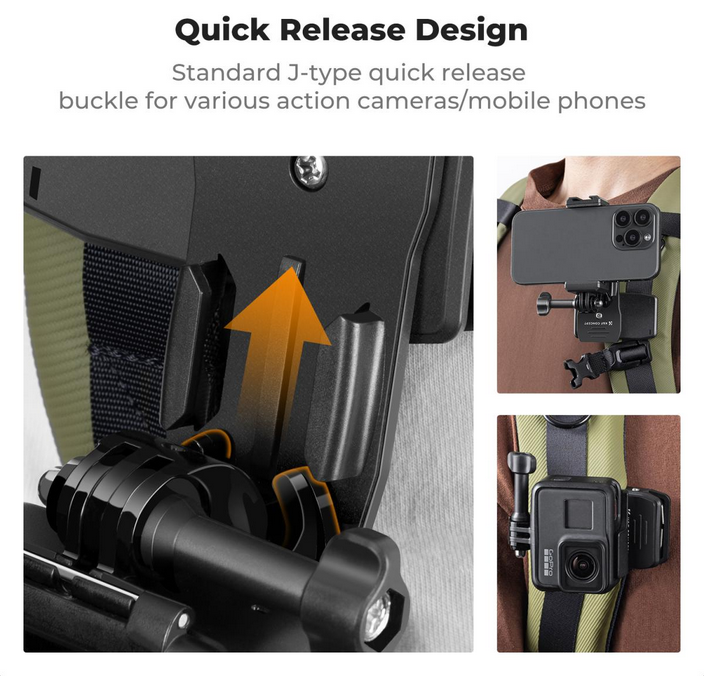 Su hebilla de cierre rápido permite cambiar de dispositivo sin problemas, para que no te pierdas ni un solo momento. Ya sea que practiques senderismo, ciclismo o vlogging, esta resistente hebilla es una solución fiable y versátil para fijar tu cámara o teléfono.