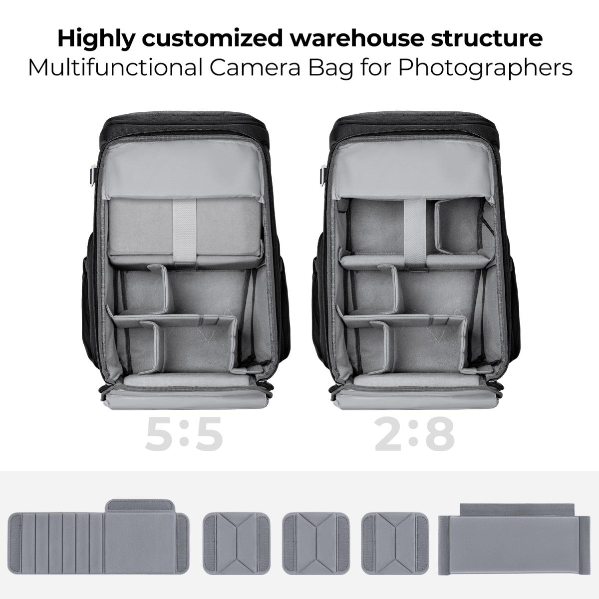 Te presentamos nuestra innovadora mochila fotográfica con diseño Magic Bin, que permite adaptar la distribución del espacio a las distintas necesidades fotográficas. Las varillas de soporte internas ocultas garantizan la estabilidad, y la ampliación de la anchura frontal con un compartimento para el estabilizador aumenta la capacidad. Gracias al acceso superior y lateral y al compartimento suspendido para un ordenador de 16 pulgadas, esta mochila ofrece versatilidad, seguridad y comodidad para los fotógrafos que viajan.