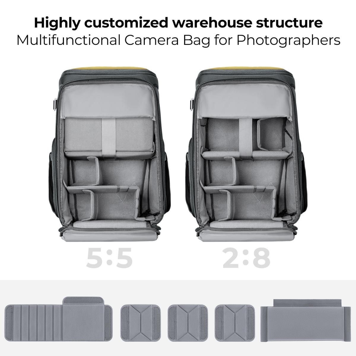 Presentamos la innovadora mochila fotográfica Magic Bin, con un diseño de espacio personalizable en proporción 5:5 y 2:8 para satisfacer diversas necesidades fotográficas, incluyendo la fotografía de exteriores, callejera y de retratos. Garantiza la estabilidad gracias a unas varillas de refuerzo internas ocultas y, al ampliar la anchura frontal, permite aumentar la capacidad en 2-3 litros. El acceso superior y lateral, junto con el compartimento suspendido de 16 pulgadas para el ordenador, ofrece comodidad y seguridad, y evita que el ordenador sufra impactos directos. Ideal para fotógrafos que buscan versatilidad y protección para su equipo.