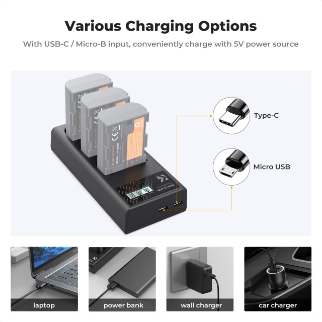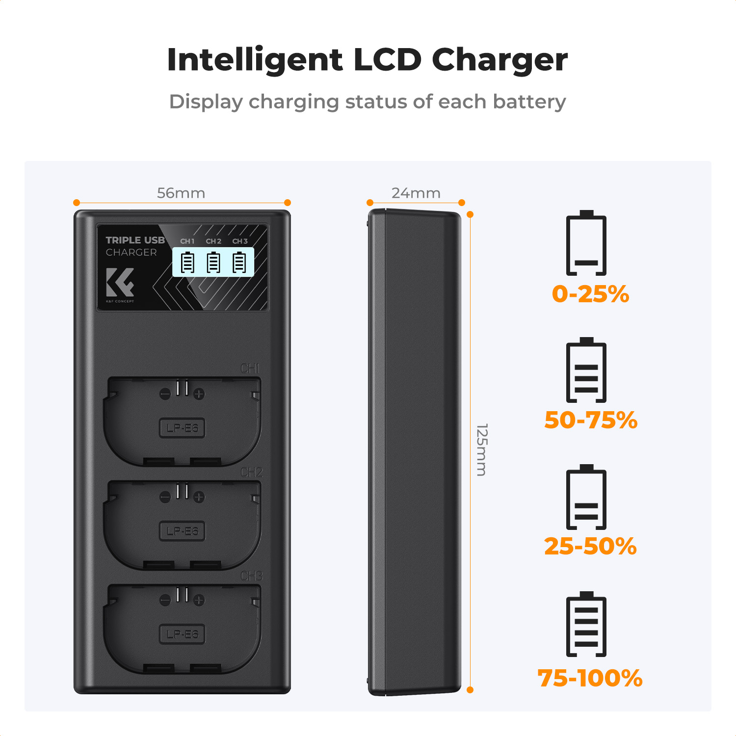 K&F CONCEPT Canon LP-E6NH 3-pack Camera Charger with LCD Display/With Micro USB and Type-C cable