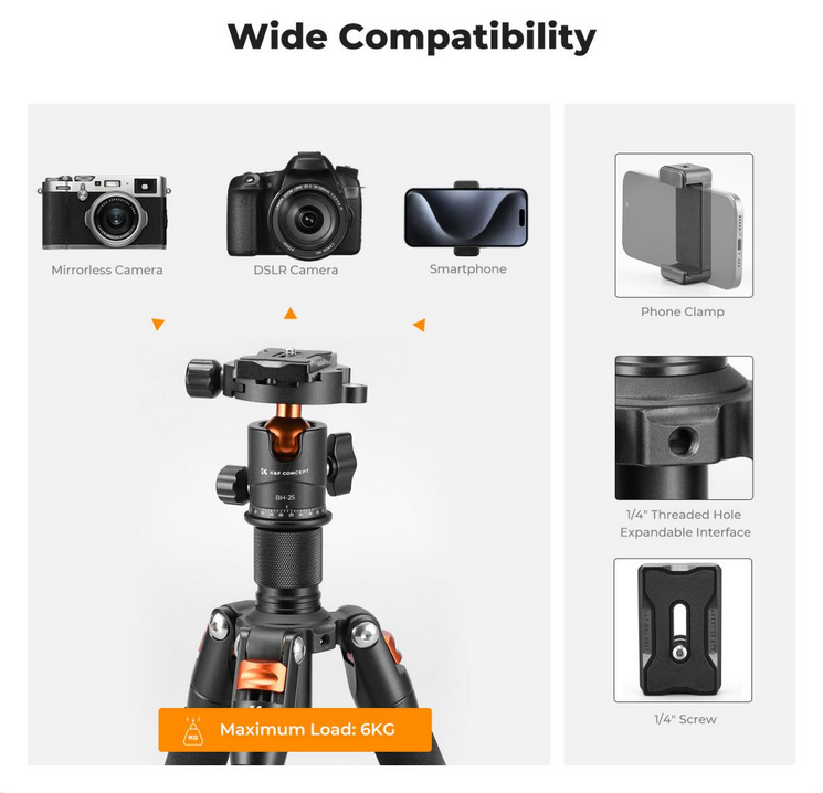 Amplia compatibilidad: gracias a su tornillo universal de 1/4", este trípode se puede acoplar fácilmente a cámaras réflex digitales, videocámaras, teléfonos inteligentes y luces de vídeo, por lo que es versátil para diversos escenarios fotográficos.