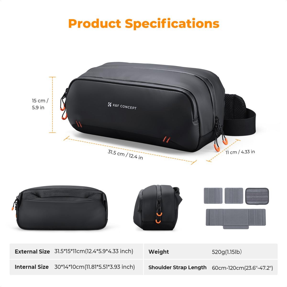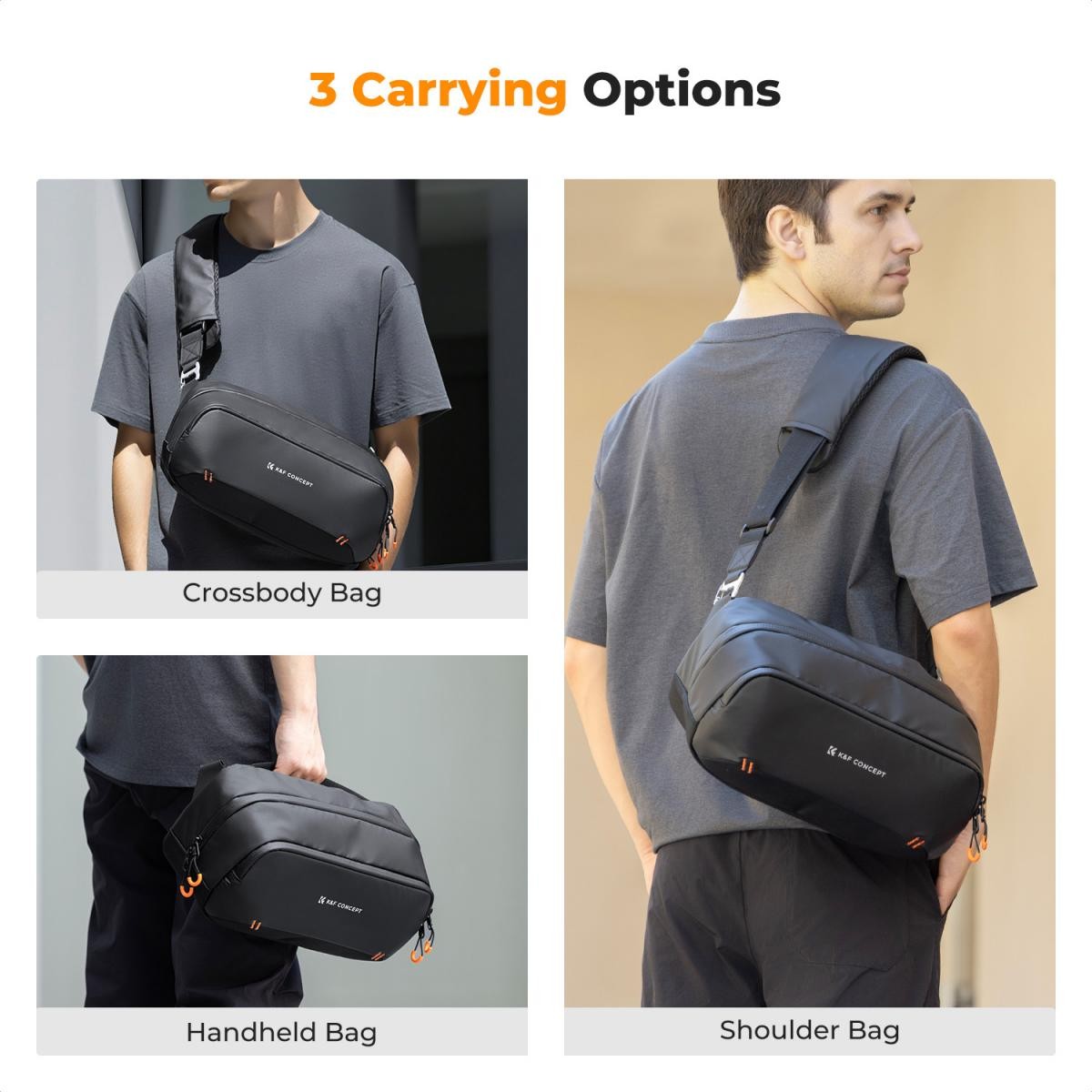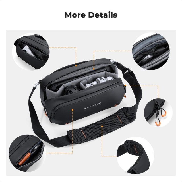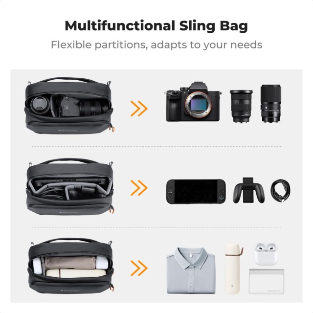 Bolso digital K&F Concept Sling Bag: un bolso versátil «todo en uno» para creadores, con capacidad para una Steam Deck, una DJI Pocket 3, cámaras sin espejo y otros objetos esenciales. Cuenta con separadores ajustables, protección repelente al agua y tres opciones de transporte.