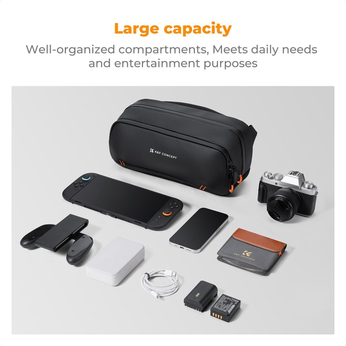 La bolsa de almacenamiento digital de K&F Concept es la compañera perfecta para los creadores modernos que utilizan varios dispositivos y viven nuevas aventuras cada día. Esta bolsa compacta pero espaciosa puede albergar fácilmente consolas portátiles como la Steam Deck o la Switch 2, equipos para vlogging como la DJI Pocket 3 o la Action 4, cámaras sin espejo completas de Sony, Canon o Nikon, así como los objetos imprescindibles para el uso diario, como teléfonos y baterías externas. En el interior destaca un sistema flexible de múltiples compartimentos con separadores antichoque y ajustables para asegurar tu equipo, un bolsillo especial para baterías que evita cortocircuitos y arañazos, y una cremallera frontal para acceder rápidamente a objetos como llaves o auriculares. Está fabricada con un tejido de PU resistente e hidrófugo, con cremalleras impermeables selladas en ambos lados y un forro reforzado que protege los dispositivos electrónicos de la lluvia, los golpes y los impactos. Con unas dimensiones de tan solo 31,5 cm x 15 cm x 11 cm, es ideal para equipos de vlogging o equipaje de viaje, y cuenta con un bolsillo de seguridad oculto para objetos de valor. La correa ajustable y extraíble permite cambiar fácilmente entre los modos de hombro, cruzado o de mano, lo que garantiza comodidad durante todo el día en los desplazamientos, durante las grabaciones o al crear contenido mientras viajas.