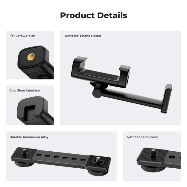 Mejora tus grabaciones con la DJI Osmo Pocket 3 gracias al soporte para móvil de K&F Concept, diseñado para acoplarse fácilmente a tu smartphone y ofrecerte una pantalla más grande y un control más preciso de la cámara. La base de conexión está fabricada en aleación de aluminio anodizado mecanizado con CNC, mientras que la abrazadera para el teléfono está fabricada en plástico PC+ABS de alta calidad y acero inoxidable, lo que garantiza una conexión segura y estable. Su diseño universal permite un giro horizontal y vertical de 360°, junto con un ajuste de inclinación de 180°, para que puedas capturar imágenes desde prácticamente cualquier ángulo. Sus amplias opciones de expansión incluyen seis puertos adicionales de 1/4" en la base, lo que suma un total de ocho, además de una placa de montaje y un puerto de 1/4" en la propia abrazadera del teléfono. Conecta fácilmente trípodes, palos selfies, micrófonos o luces adicionales y mejora así tu experiencia de grabación. Ideal para creadores que necesitan flexibilidad, estabilidad y opciones de ajuste profesionales en un único accesorio compacto.