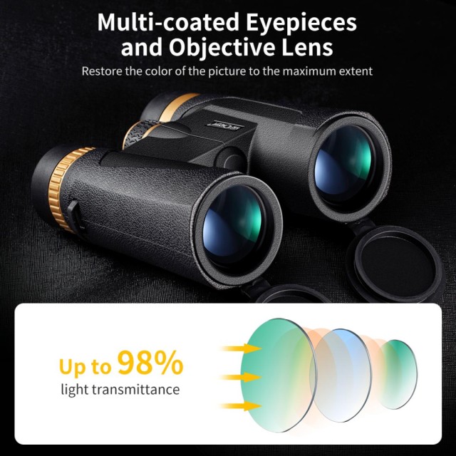 - * 【Prisma BAK4 y revestimiento multicapa】: Tanto en el ocular como en el objetivo se utiliza un prisma BAK4 de alta calidad + un revestimiento FMC de banda ancha verde en toda la superficie, que es transparente y nítido, elimina eficazmente las pérdidas internas de luz y evita los bordes oscuros en la imagen. La transmisión de luz alcanza hasta el 97 %. El sistema óptico refleja la luz; tanto si busca aves como si intenta ver mejor el escenario, le ayudará a observar el objetivo en alta resolución, proporcionándole el mejor brillo y colores fieles, y mejorando la reproducción de la imagen.
