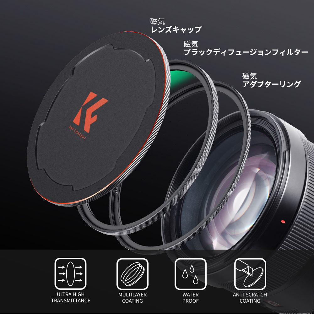 El filtro magnético K&F Concept Nano-X Black Mist Filter 1/8 de 67 mm se suministra con un anillo adaptador magnético y una tapa magnética para el objetivo en un estuche de almacenamiento compacto. El anillo adaptador de 67 mm se enrosca en los objetivos que tienen una rosca frontal de filtro de 67 mm. A continuación, el filtro difusor negro se fija magnéticamente al anillo adaptador y se puede retirar con la misma facilidad cuando se desee cambiar por otro filtro magnético de la marca K&F. Cuando termine de fotografiar, puede fijar magnéticamente la tapa de objetivo al filtro difusor. La tapa de objetivo también cuenta con una rosca para acoplarse directamente a los objetivos.
