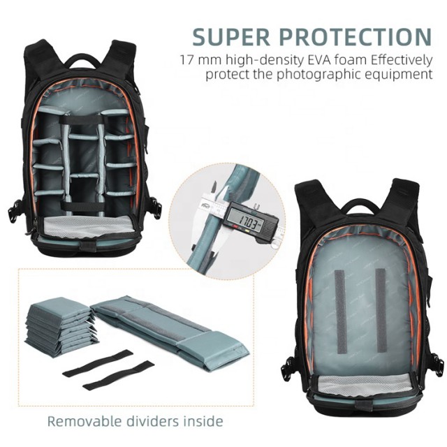 Esta mochila K&F, con un amplio compartimento principal, tiene capacidad para una cámara réflex digital con el objetivo montado, mientras que su sistema modular de compartimentos separa, organiza y protege los objetivos, los flashes, los trípodes y otros accesorios según tus necesidades.