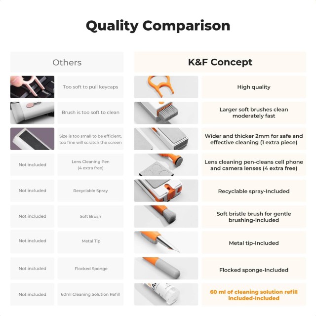 El nuevo y mejorado kit K&F Concept 11 en 1 para la limpieza de teclados y dispositivos electrónicos, con 60 ml de líquido limpiador, es una solución portátil completa para la limpieza profunda y segura de teclados, pantallas, auriculares, cámaras y dispositivos electrónicos comunes.
