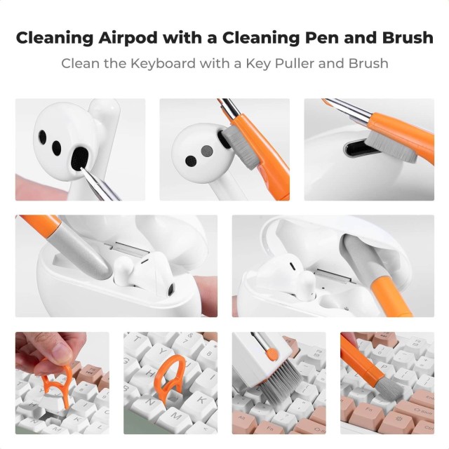 El kit contiene 11 herramientas de limpieza imprescindibles, cada una de ellas adaptada a una tarea concreta. El cepillo telescópico y el cepillo largo eliminan eficazmente el polvo de superficies grandes, como teclados y portátiles, mientras que la herramienta para retirar teclas permite desmontarlas fácilmente para una limpieza interna a fondo. Para trabajos de precisión, son ideales las esponjas de memoria, el cepillo de alta densidad y la punta de limpieza en forma de bolígrafo, que resultan perfectas para limpiar carcasas de auriculares, orificios de audio, puertos y rincones estrechos.