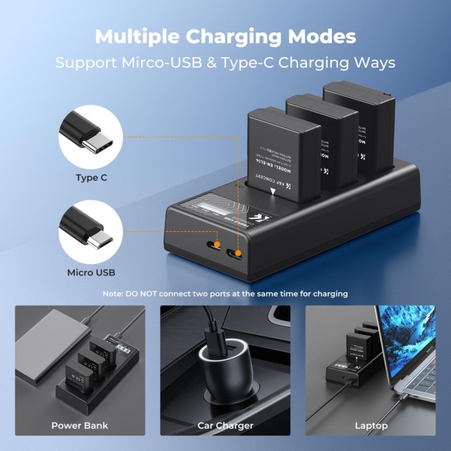 El kit incluye un cargador de baterías LCD de 3 ranuras que permite cargar tres baterías a la vez y muestra el estado de carga de cada una de ellas en una pantalla LCD de fácil lectura. El cargador admite doble entrada a través de Micro USB o Type-C (5 V/2,1 A), lo que lo hace compatible con adaptadores de pared, cargadores para coche, ordenadores portátiles y otras fuentes de alimentación USB. Al utilizar la entrada Type-C, las tres baterías se pueden cargar completamente en aproximadamente 3,8 horas.