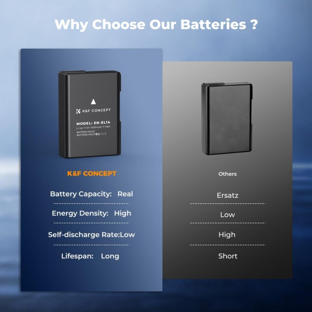 El juego de baterías K&F Concept Nikon EN-EL14 incluye 3 baterías de alta capacidad EN-EL14/EN-EL14a con una capacidad de 1050 mAh y una tensión de 7,4 V, que proporcionan una larga autonomía para disparar de forma ininterrumpida con cámaras Nikon. Compatible con modelos como la D5600, D5500, D5300, D5200, D5100, D3500, D3400, D3300, D3200, D3100, Coolpix P7000/P7100/P7200/P7700/P7800 y otros dispositivos alimentados por baterías EN-EL14.