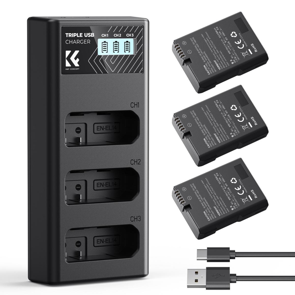 K&F Concept: paquete de 3 baterías EN-EL14 para cámaras Nikon con cargador LCD de 3 ranuras. Incluye baterías EN-EL14 con una capacidad de 1050 mAh y un cargador con pantalla LCD y doble entrada Micro USB/Type-C para una carga rápida y segura.