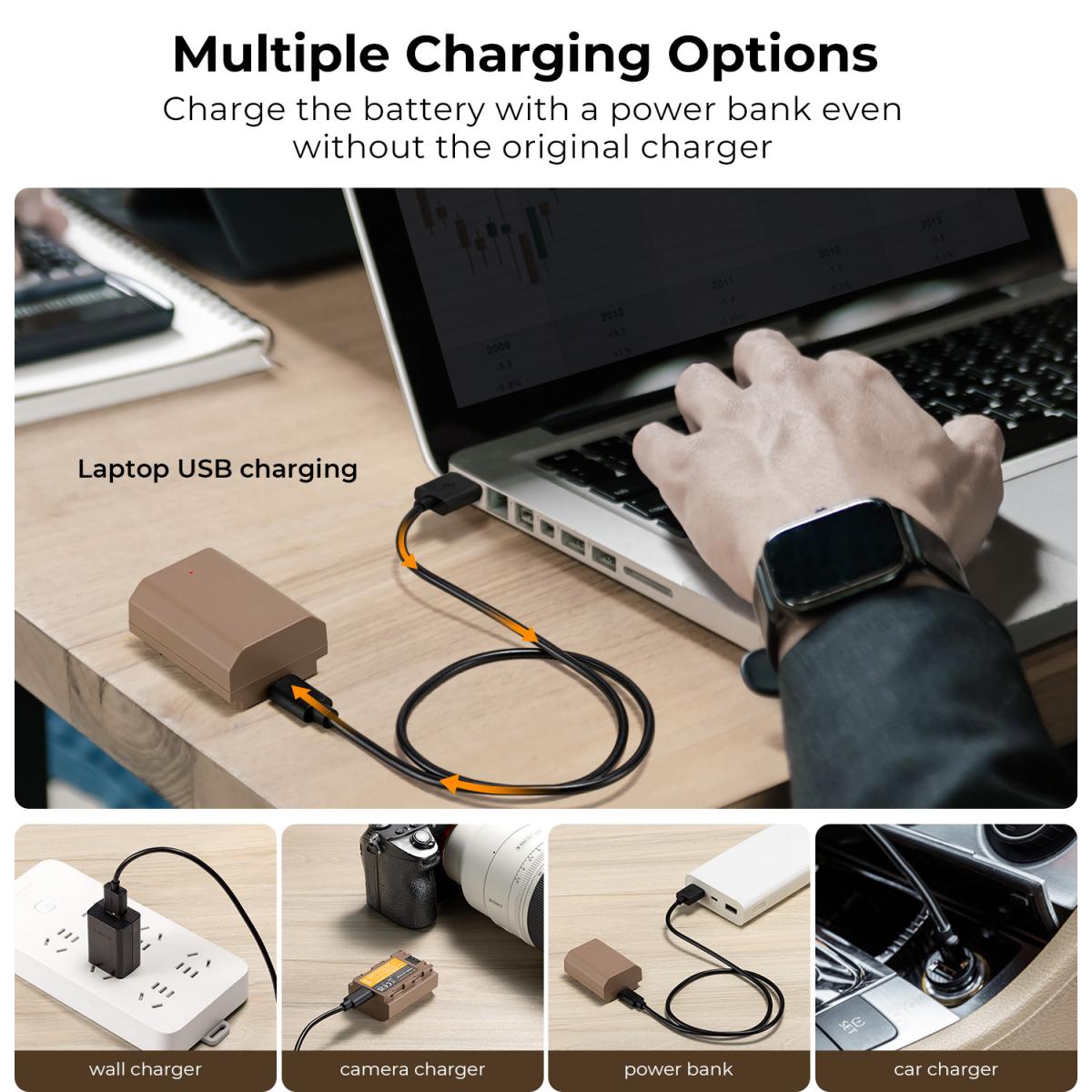 * 【Otras opciones de carga】 La batería se puede cargar directamente mediante un cable de carga tipo C y también es compatible con la carga mediante un cargador especial para NP-FZ100; la carga mediante un cargador USB de red, un cargador para coche o una fuente de energía móvil externa ofrece más opciones para cargar la batería.