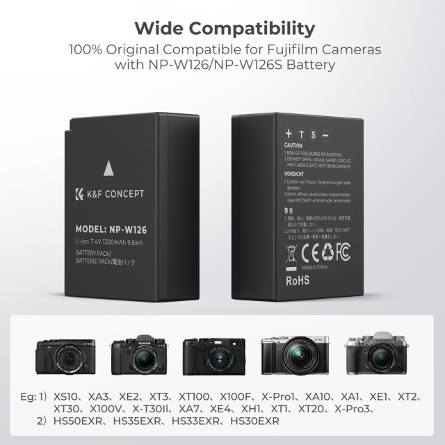 El pack de dos baterías K&F CONCEPT NP-W126 incluye dos baterías de repuesto de alta capacidad (1300 mAh) y un cargador de dos ranuras, que proporciona un rendimiento fiable y duradero para las cámaras Fujifilm compatibles. Gracias a la compatibilidad con la carga a través de Micro-USB y USB-C, y a las protecciones de seguridad integradas, este kit es ideal para fotógrafos que necesitan una fuente de energía flexible y fiable cuando están de viaje.