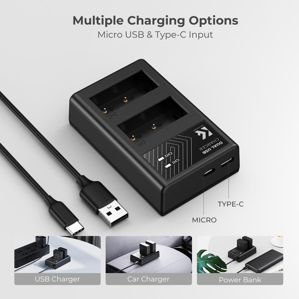 Las baterías totalmente decodificadas garantizan una compatibilidad estándar y una comunicación fluida con las cámaras compatibles, al tiempo que son compatibles con los cargadores originales de Fujifilm. El kit incluye un cargador de dos canales que permite cargar dos baterías a la vez y está equipado con puertos de entrada Micro-USB y USB-C para una carga universal. El cargador se puede alimentar mediante un powerbank, un adaptador USB de pared, un ordenador portátil o un cargador para coche para una máxima comodidad.