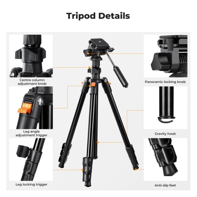 - * 【CIERRES DE LIBERACIÓN RÁPIDA】Los cierres de liberación rápida permiten bloquear y desbloquear las patas del trípode en cuestión de segundos con una sola mano, para que nunca te pierdas ningún momento fotográfico excepcional.