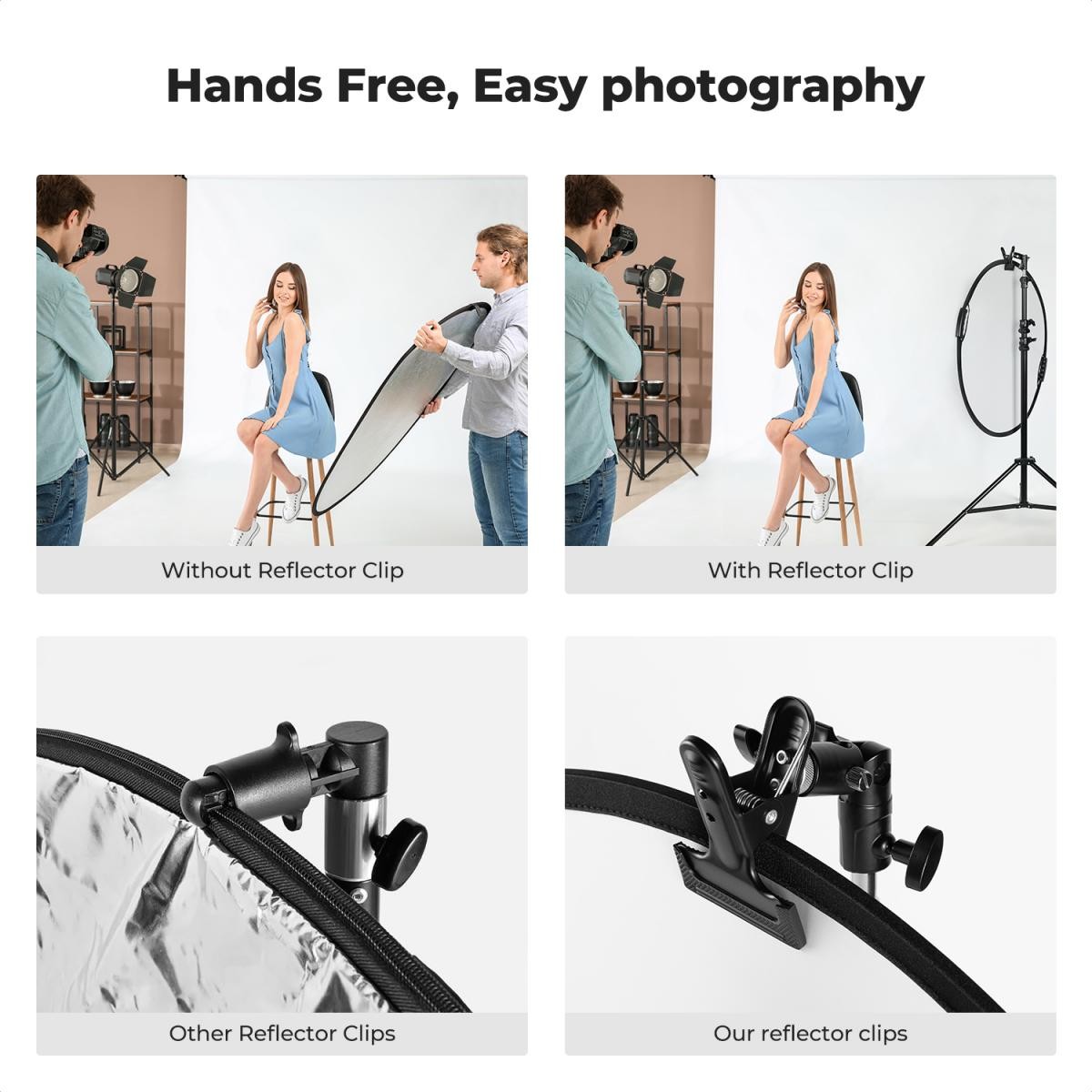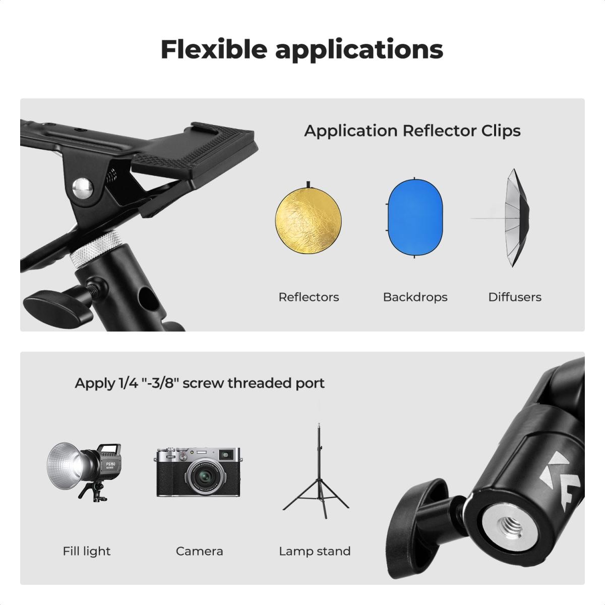 El soporte para reflector K&F CONCEPT Heavy-Duty Photography Reflector Bracket está equipado con una pinza metálica resistente, un revestimiento antideslizante y una base universal de 5/8", lo que permite a los fotógrafos fijar de forma segura los reflectores o los paraguas sin necesidad de un asistente, garantizando así un control estable y cómodo de la iluminación.