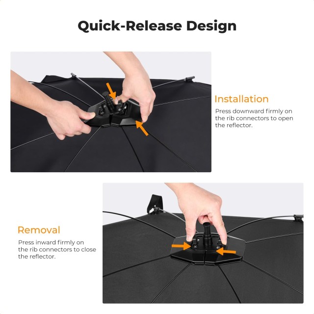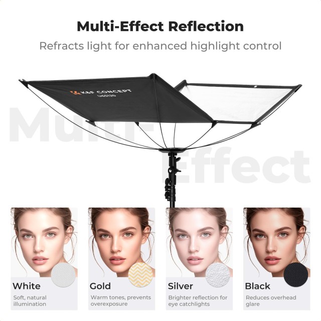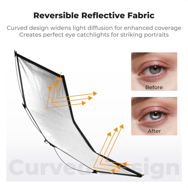El K&F CONCEPT Quick-Release Curved Reflector-Two Moves to Soft Light es una solución de iluminaciónprofesional y portátil para fotógrafos que buscan un control de la luz rápido, versátil y de alta calidad. Pesa tan solo 690 g (el reflector) y 1,5 kg (el kit completo) y se suministra con un soporte de luz de 1,5 m de altura y una funda con cordón para facilitar su transporte. Su innovador diseño de liberación rápida permite montarlo en dos sencillos pasos —soltar la correa y presionar el conector central hasta que encaje—, lo que ahorra tiempo en comparación con los reflectores tradicionales. Su superficie curvada de 123 × 65 cm difumina suavemente la luz alrededor del sujeto, mejora los tonos de la piel y crea hermosos reflejos en los ojos. La base ajustable en 180°, equipada con un mango largo, permite un ajuste preciso del ángulo sin necesidad de herramientas. Los fotógrafos pueden cambiar al instante entre superficies reflectantes negras, plateadas, doradas y blancas mediante las cubiertas magnéticas 4 en 1, lo que les ofrece la máxima flexibilidad creativa in situ. Ideal para retratos al aire libre, fotografía de eventos y montajes profesionales de estudio.
